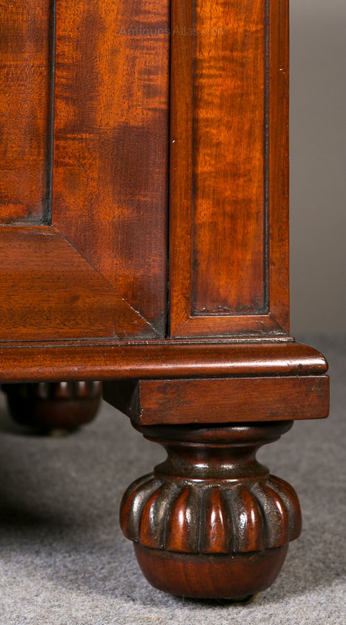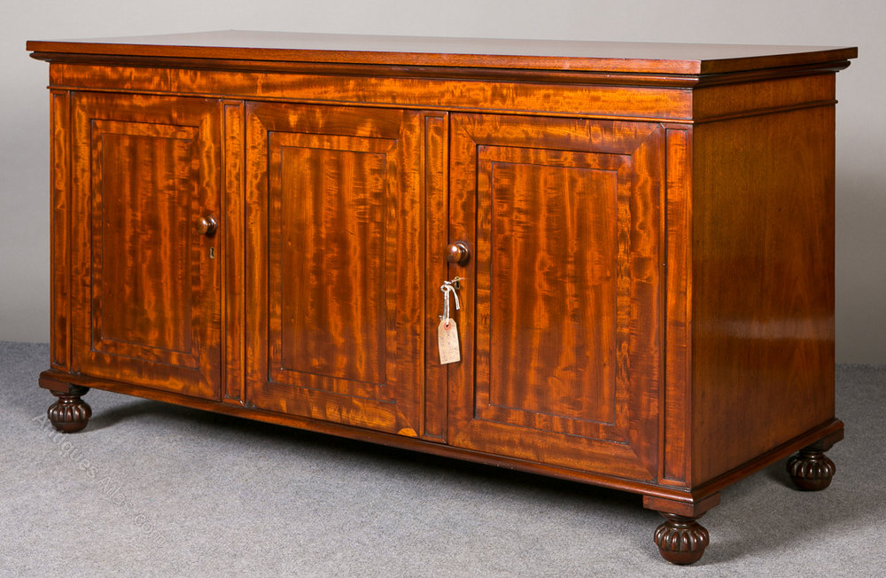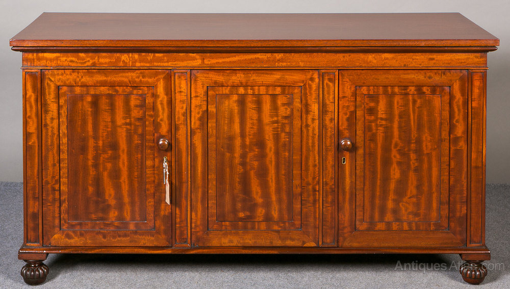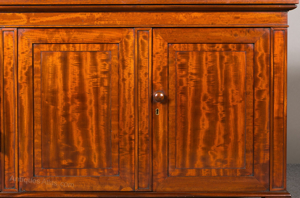 This 3 door cabinet has a solid mahogany, slightly overhanging top and cock beaded frieze. The 3 panelled doors veneered in top quality figured mahogany and turned pulls. The side stiles with applied mouldings and the whole standing on turned and gadrooned feet with sunken brass castors. The interior with mahogany faced shelves. With later working brass locks and keys.