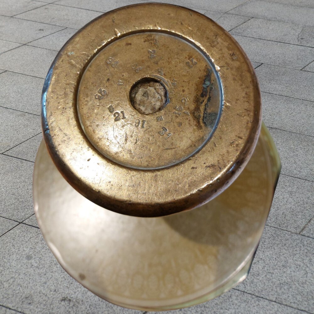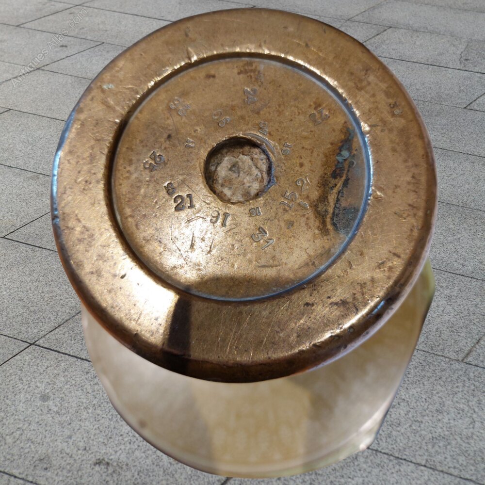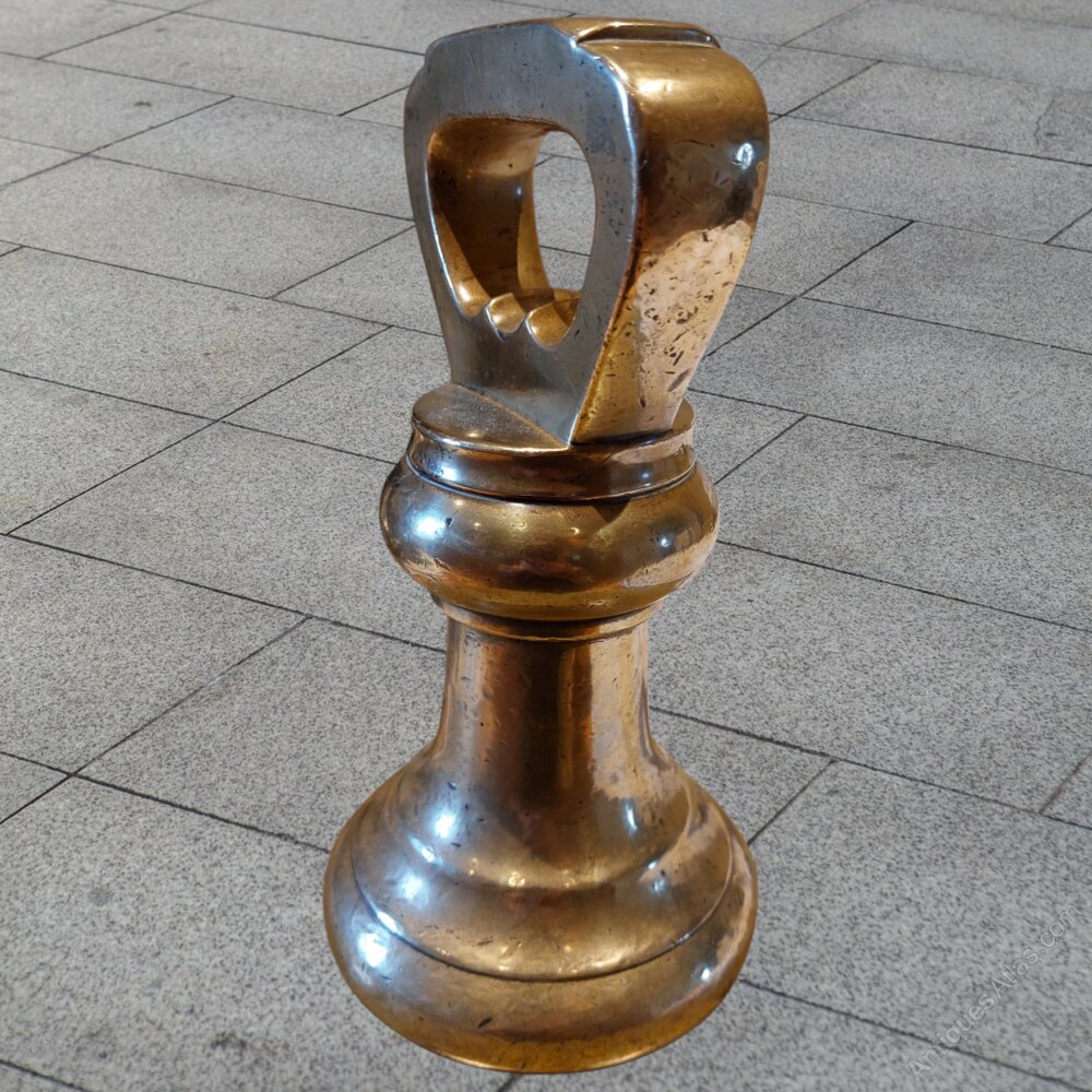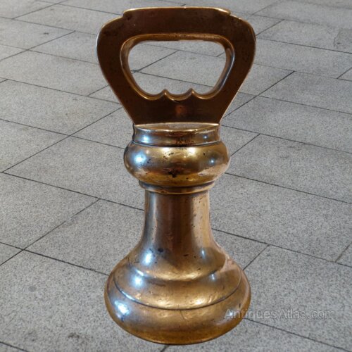 A fine looking rare 14lb bell weight. Generally now used as a quirky doorstop. Very good colour and polish. Numerous excise marks stamped to the underside dating it to the early 1900s. Ideal size for a doorstop at 9" tall on a 4 1/2" diameter base. Weight 14lbs. Very good condition.