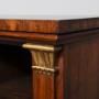 Circa 1830. Rare breakfront Regency rosewood open bookcase with gilded pilasters. The breakfront top in figured rosewood with a crossbanded fore-edge above three open bookcase sections, wider centrally all flanked and divided by pilasters with gilded capitals and acanthus bases. Each bookcase with two adjustable moulded-front shelves, sitting on a moulded enclosed plinth base.