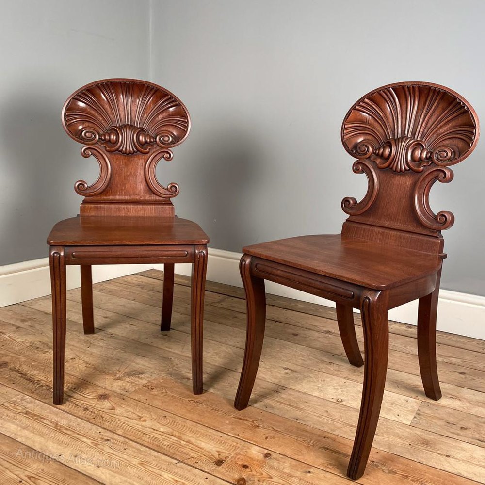 A rare pair of Gillows Mahogany hall chairs, having the highest quality crisply carved shell backs with solid seats and sabre legs. Superb colour and original finish throughout. Atb Gillows, English, Circa 1810