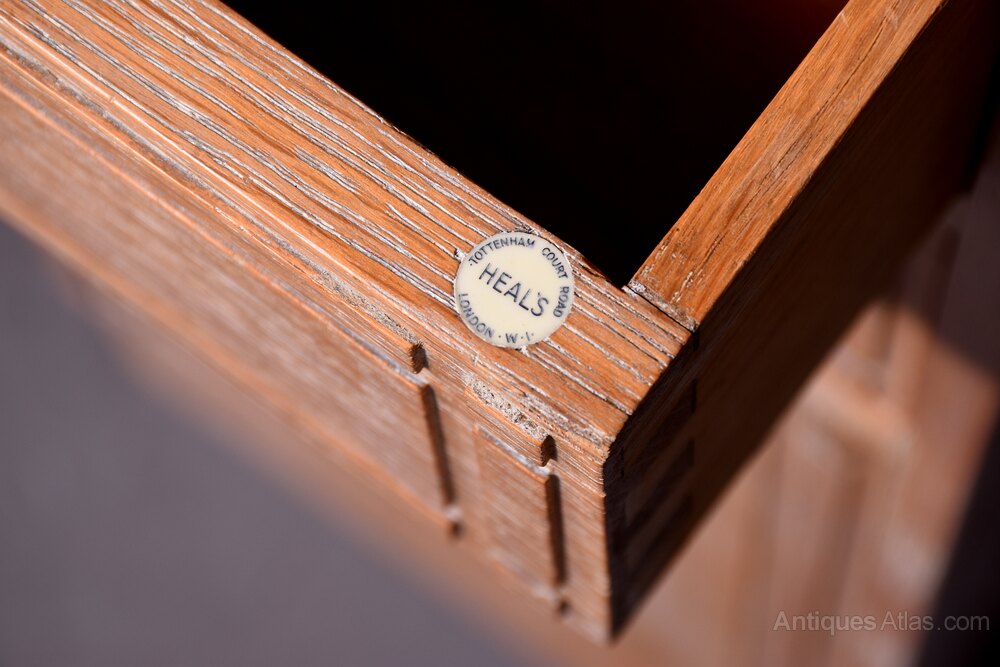 Circa 1920. Rare pair of Heal’s limed oak bedside lockers in the Art Deco style. The rectangular lockers with two short drawers with solid oak drawer liners, wooden knobs, and Art Deco decorated fronts above shelved cupboards over enclosed plinth bases. Drawer bearing embedded ivorine label ‘Heal’s, Tottenham Court Road, London W1.’