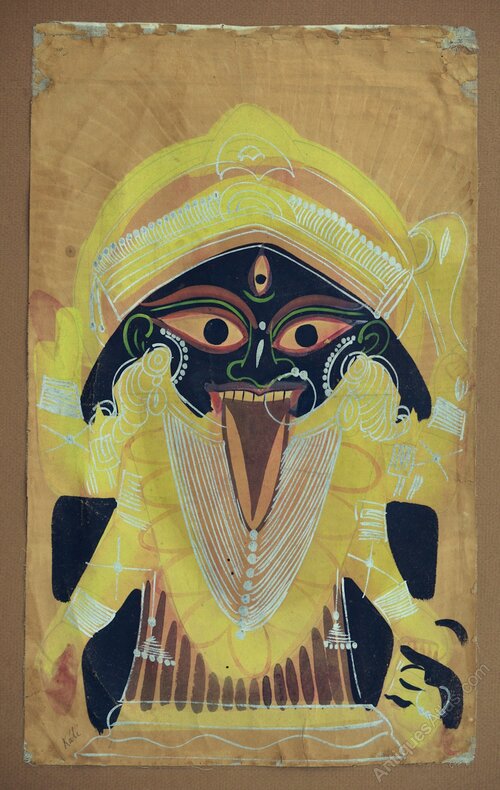Painted in opaque watercolour with silver paint (tin alloy) details, on paper laid onto cloth. Inscribed Káli in ink (lower left). The image of the goddess Kali represents the deity at the Kalighat temple in Kolkata, West Bengal, India. She is depicted haloed and four armed, in her upper left she carries a sacrificial knife (ram-dao) and in her lower left she carries a decapitated head. She sticks her tongue out in the iconographically usual way. Silver paint has been used to indicate her many items of jewellery. Some losses on the edges. Framed and glazed.