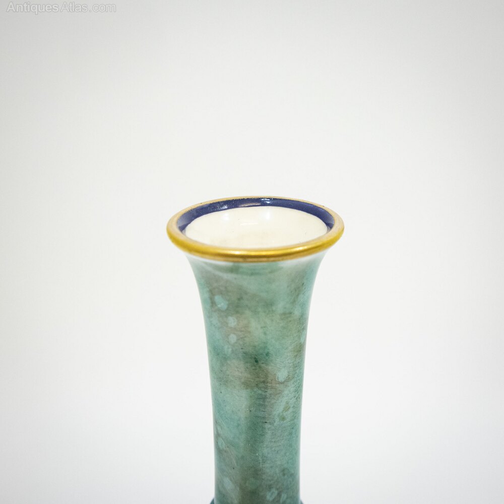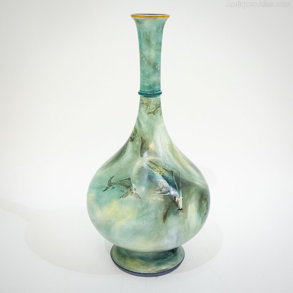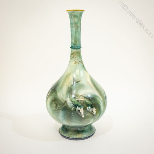 A very rare Worcester Hadley vase by the great Mary Eaton. This bud vase has a gilded rim with a thin neck and large body sitting on a foot which has been beautifully painted with images of fish. An ethereal green glaze fishes the piece.