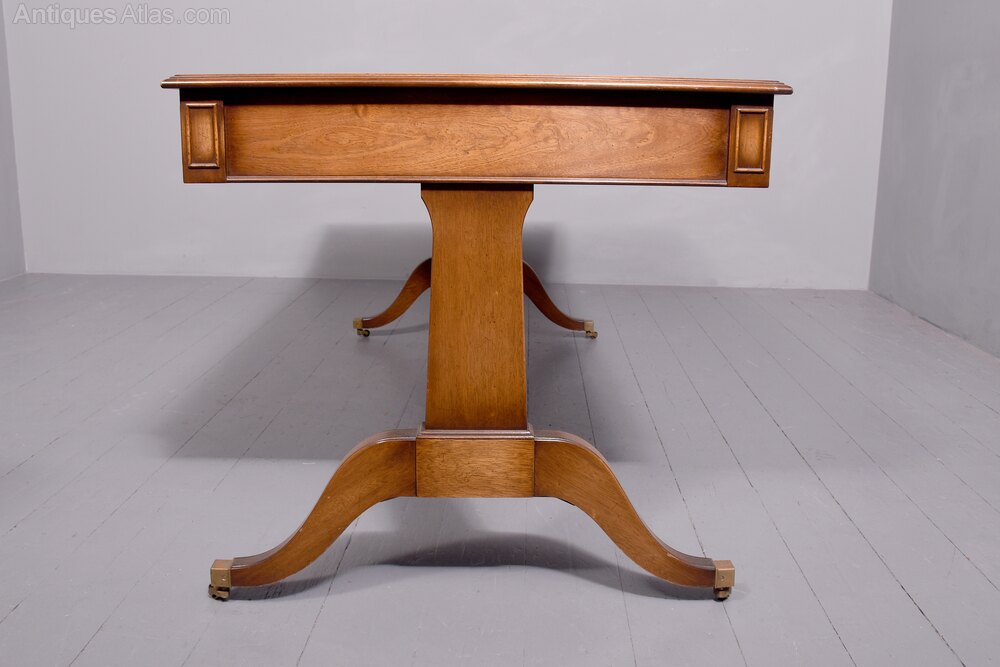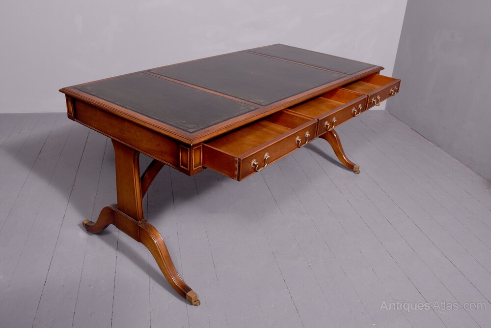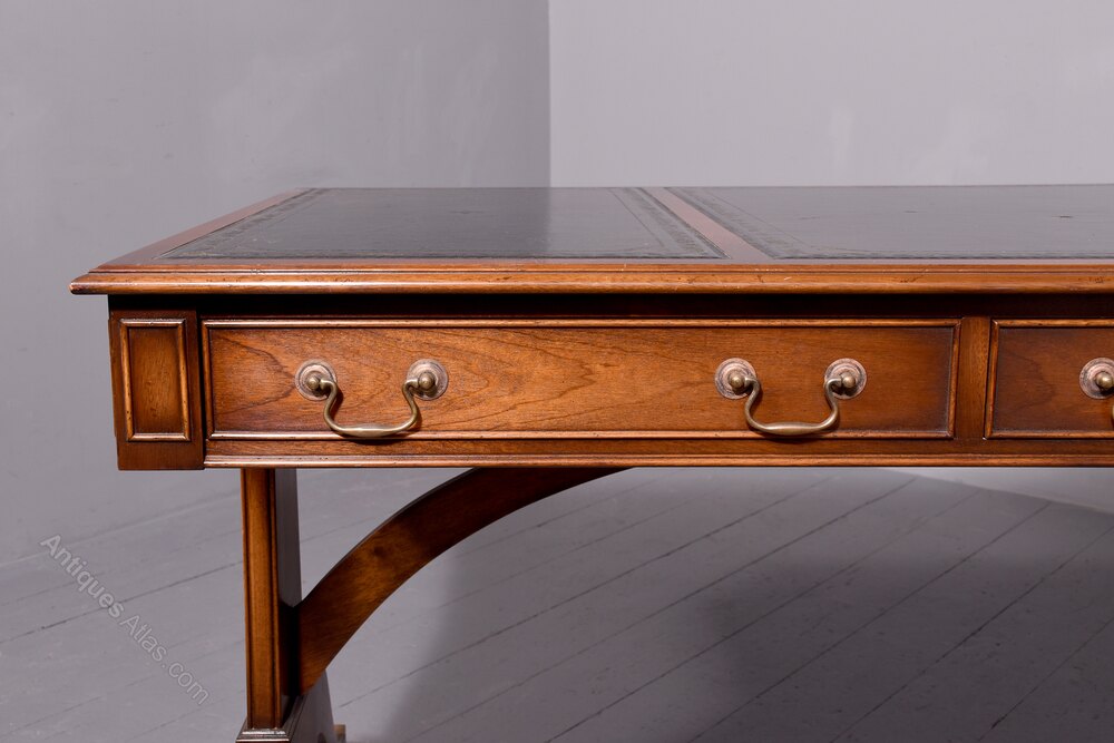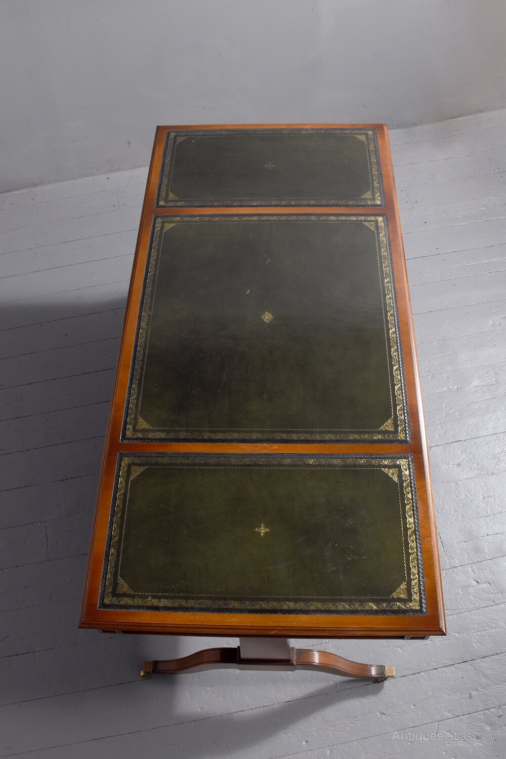 Circa 2000. Quality Regency-Style Mahogany Partners Writing Table. The writing surface with three panels of green leather with gilt tooling and a moulded edge over three frieze drawers with brass swan-neck handles and matching dummy drawers on the opposite side. Supported on trestles over twin cabriole legs with brass caps and casters.