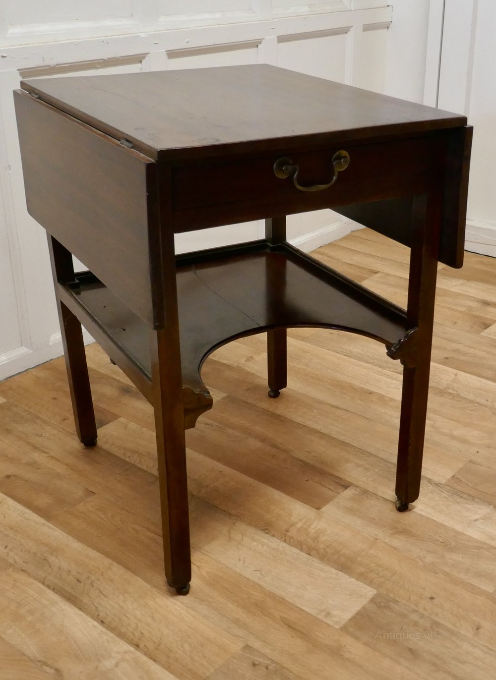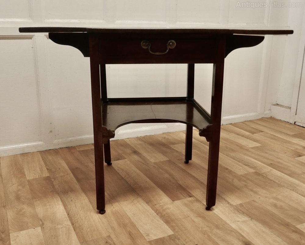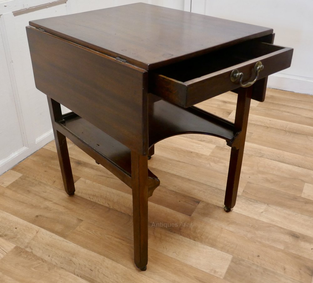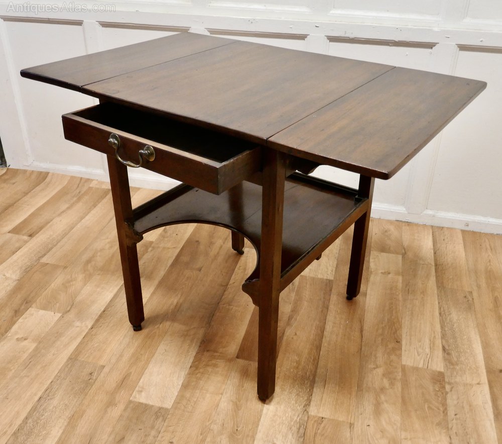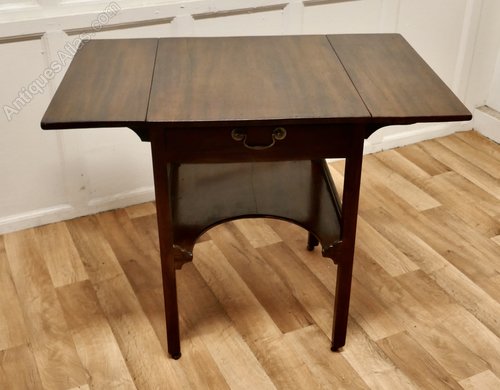 This is a rare piece indeed, the table is made in Mahogany, it has a drop leaf in each side and a drawer to the front, the table has an undertier which has a deep kneehole, the reason for this being so large is to allow the user who would have been wearing a crinoline to sit in comfort