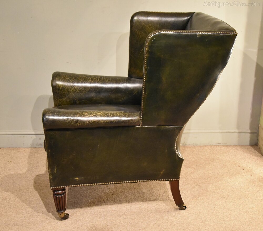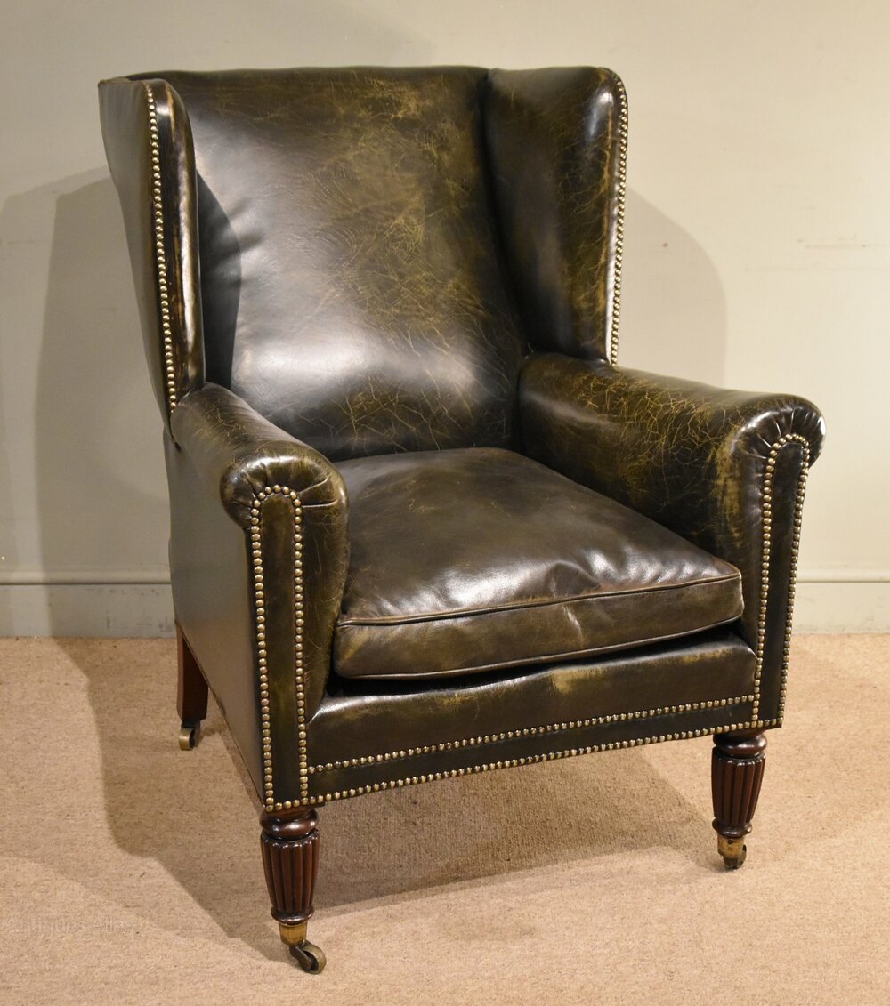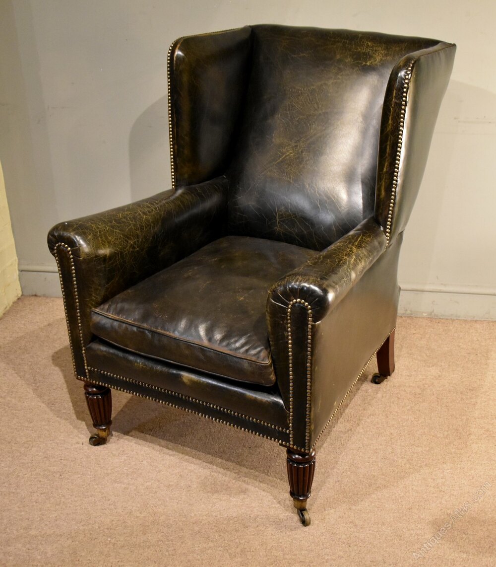 A fine quality late regency fluted leg library armchair of superb colour. Black leather hide and superb large proportions on brass caster