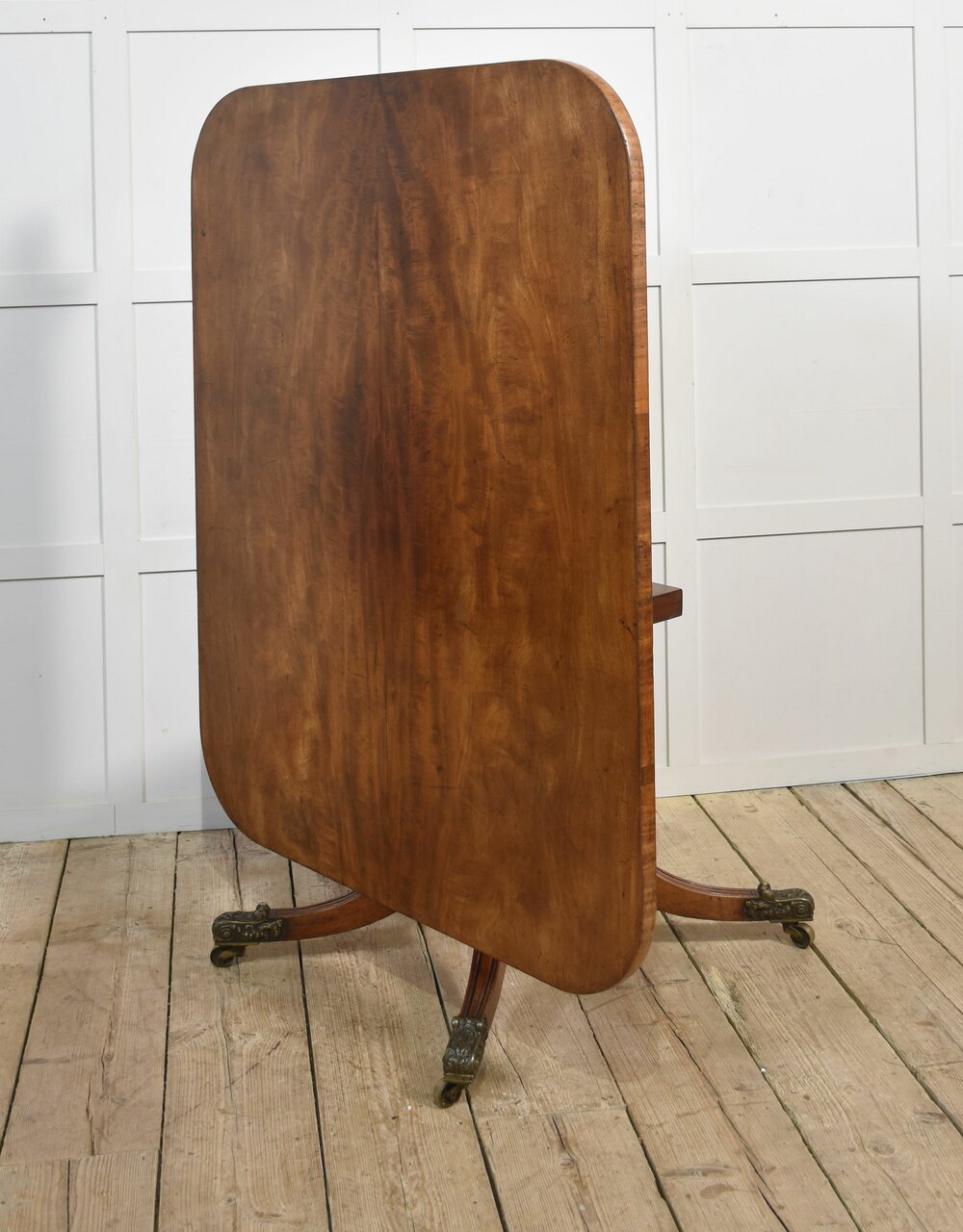 19th Century mahogany breakfast table, the rectangular well-figured tilting top. Raised on a pedestal base and four outswept legs.Terminating in well-cast brass caps and castors.