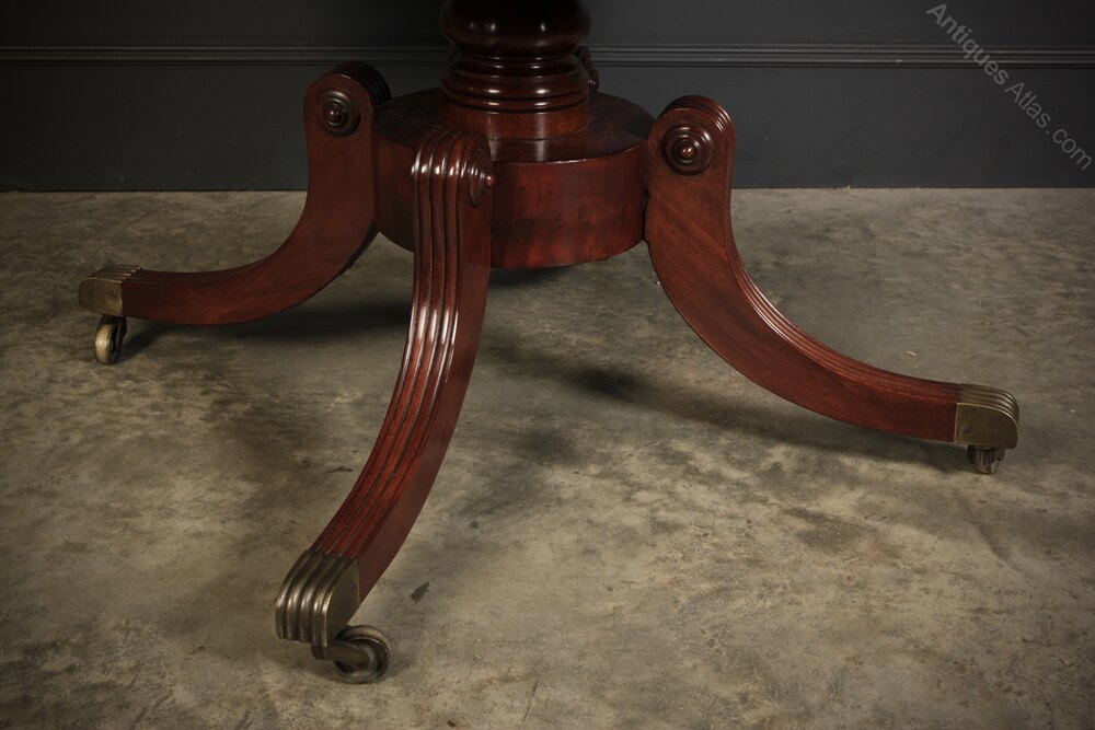 Raised on a solid mahogany turned column support, with 4 reeded legs and brass cup casters.
