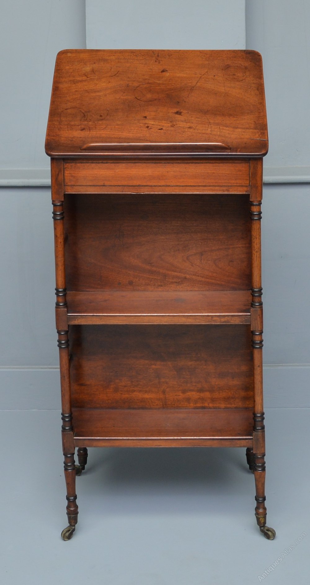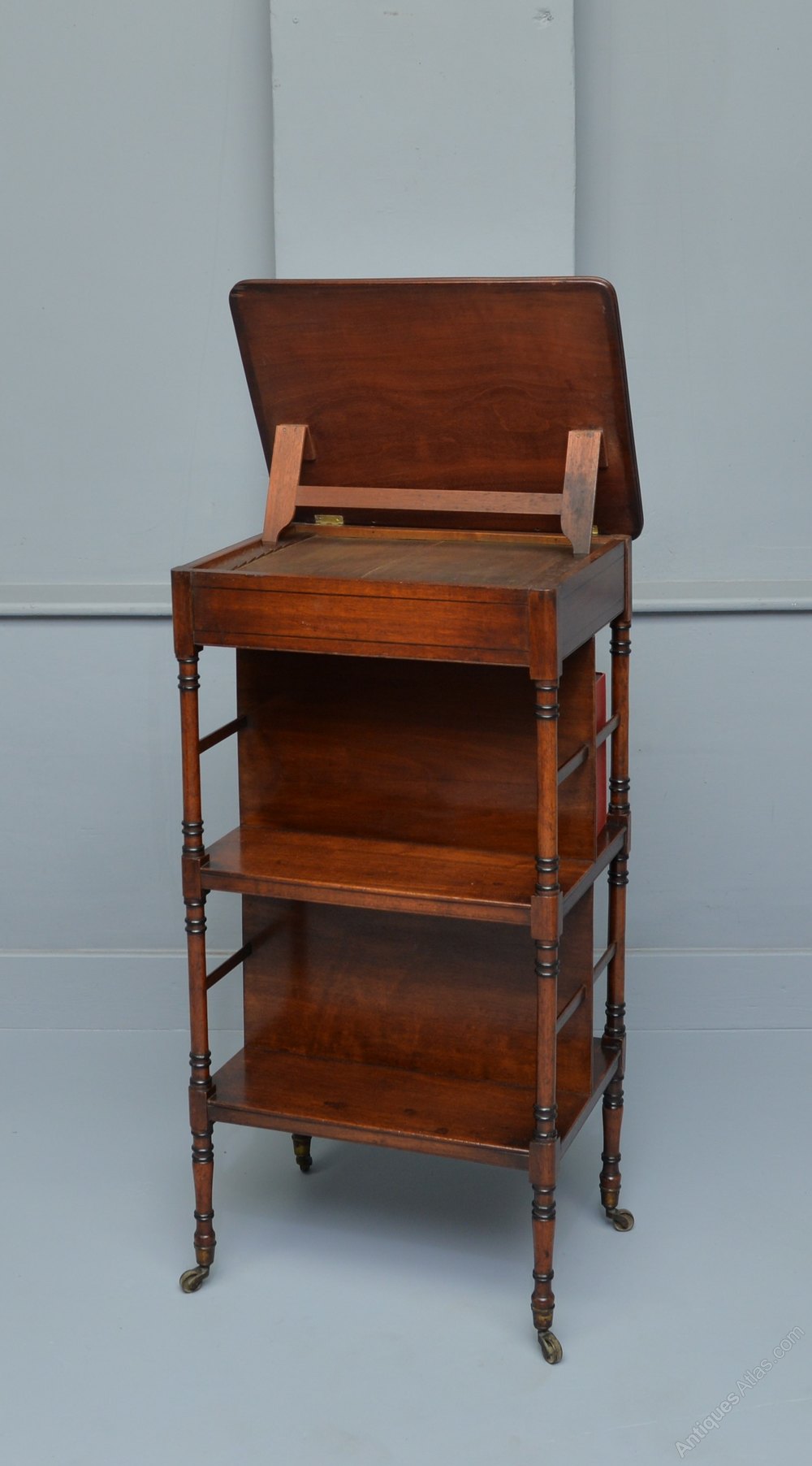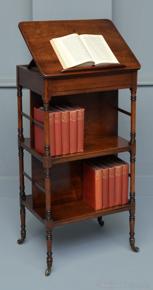The rectangular top having easel adjustment, with wooden book-rest. To the right of the book rest is a very useful drawer, with compartments for pens etc.