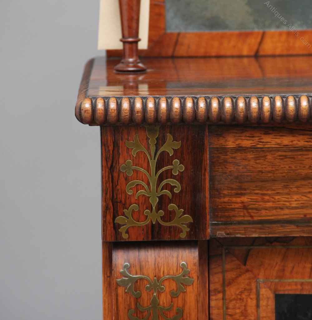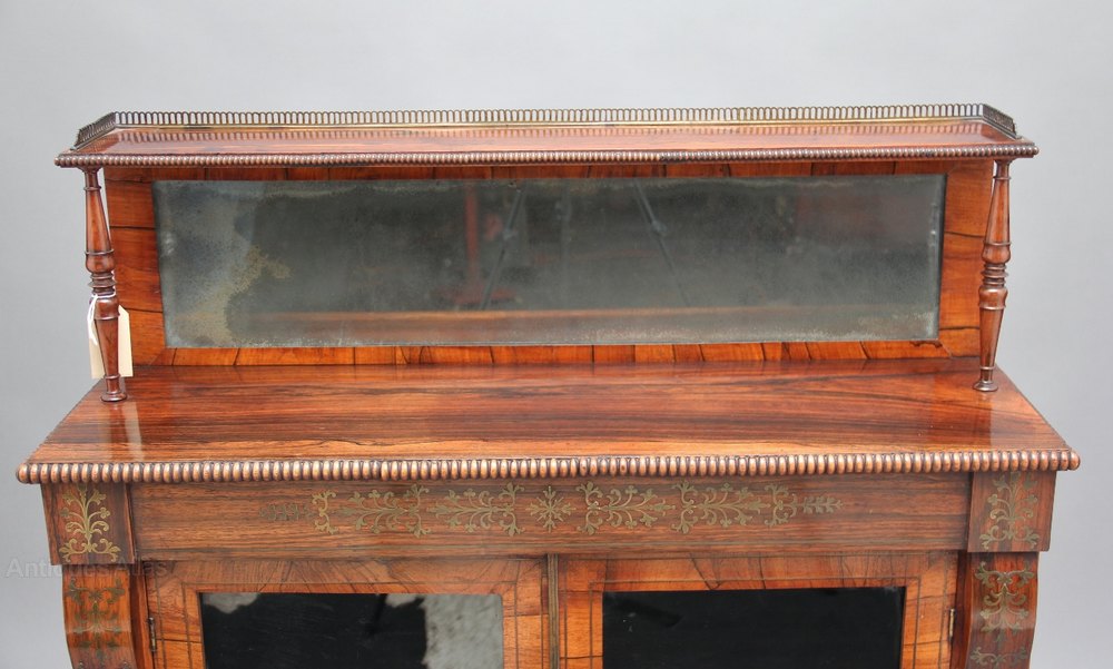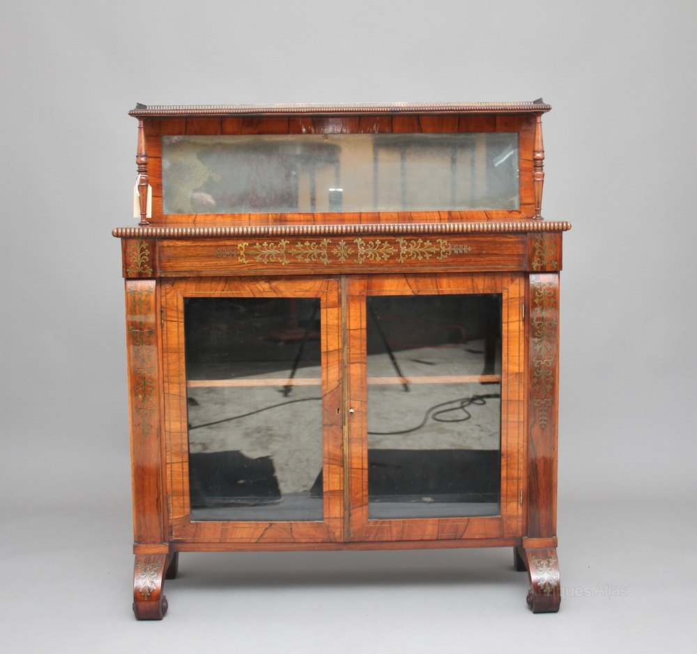 Early 19th Century Regency rosewood and brass inlaid chiffonier, the cabinet having a mirror back and shelf decorated with beading and a brass gallery running along the front and sides, supported by elegant turned columns, the top of the actual cabinet decorated with beading and the front of the cabinet having lovely quality brass inlay in the form of a floral pattern, the two glazed doors opening to reveal a single shelf inside, supported on brass inlaid scroll feet. Circa 1820.