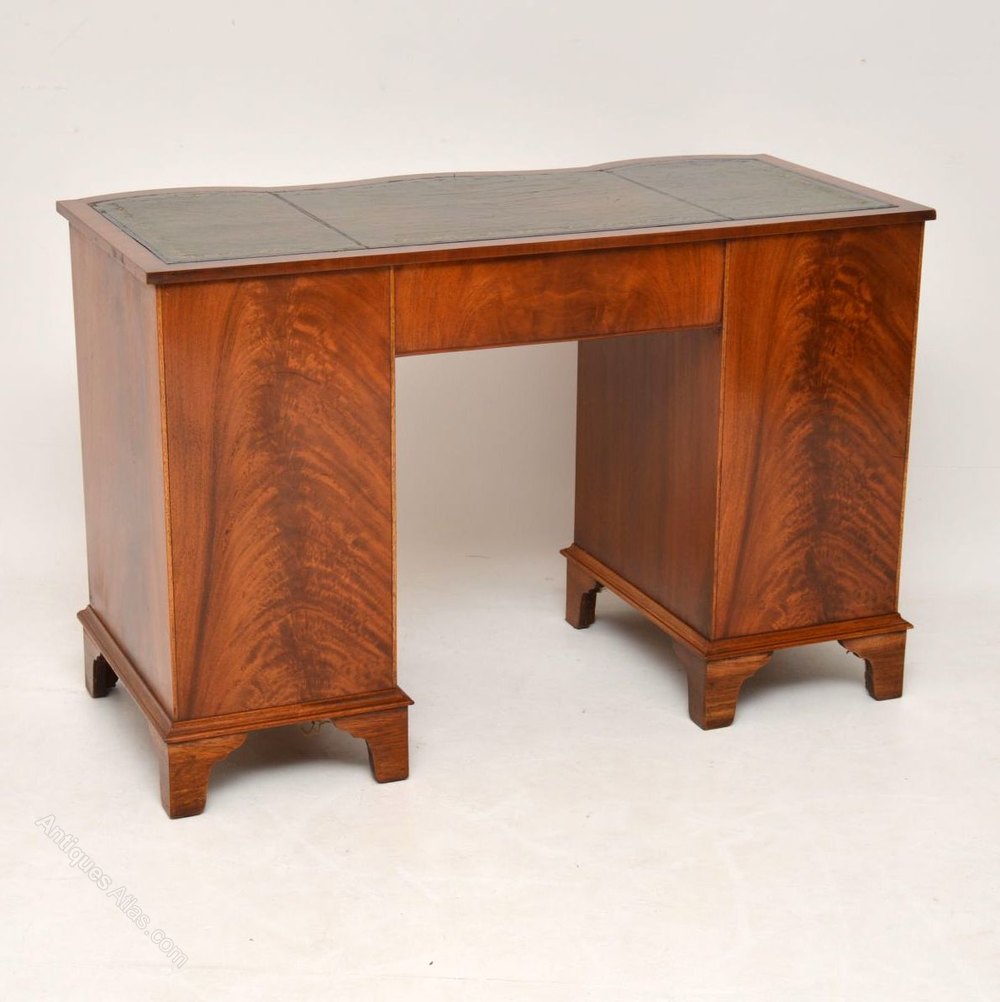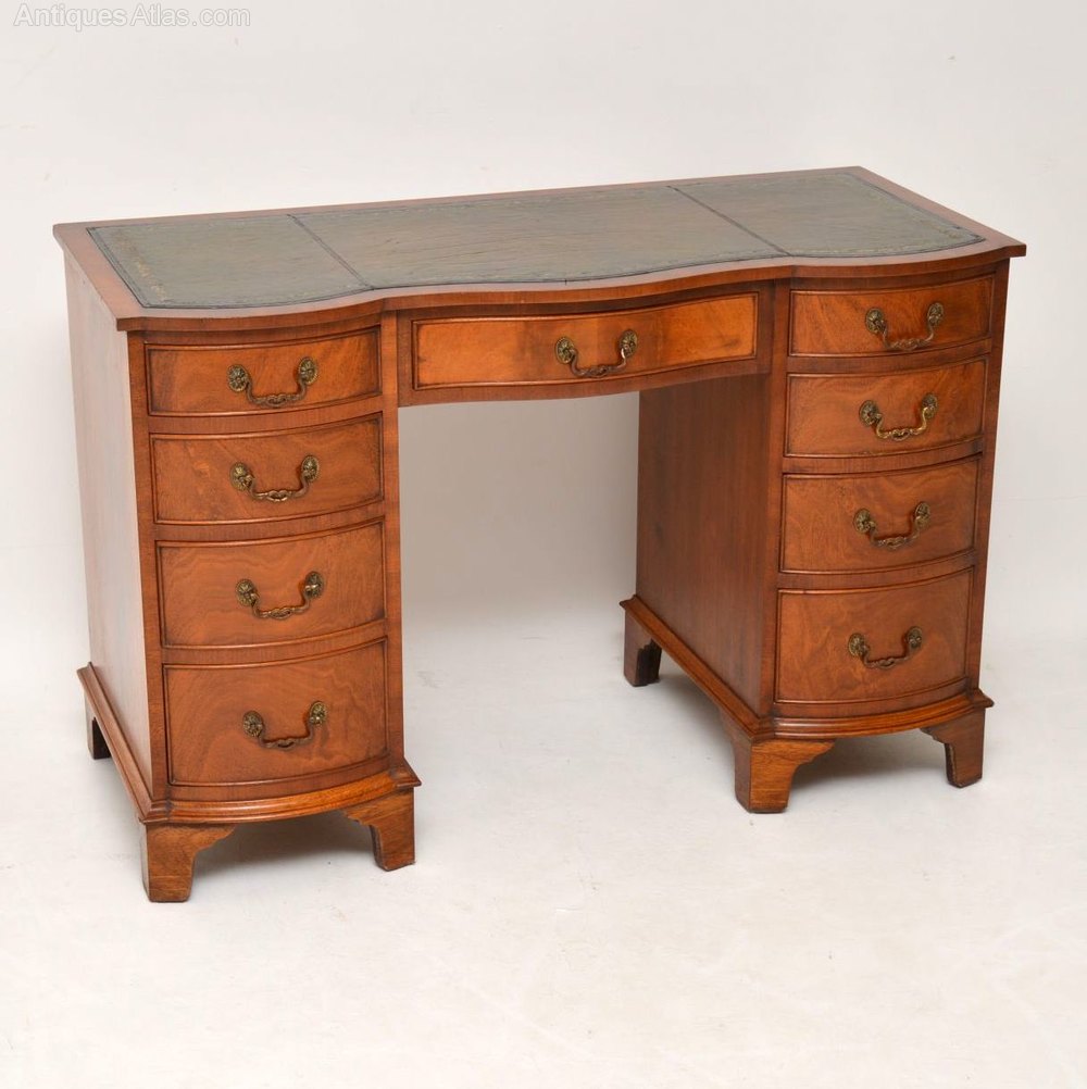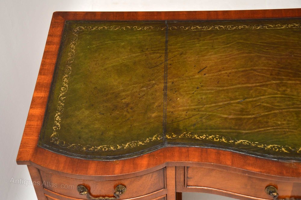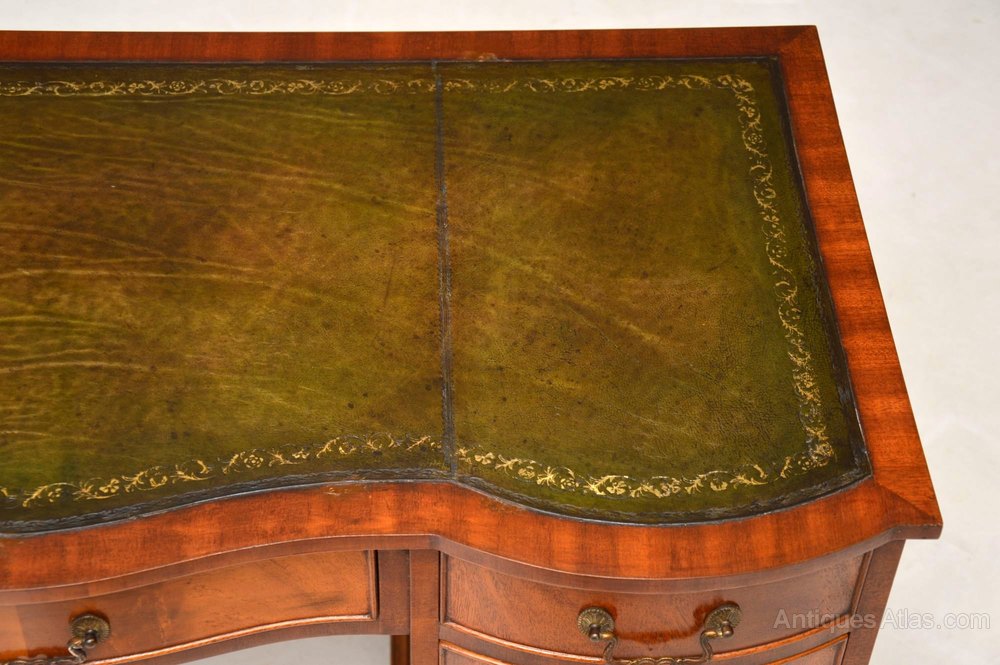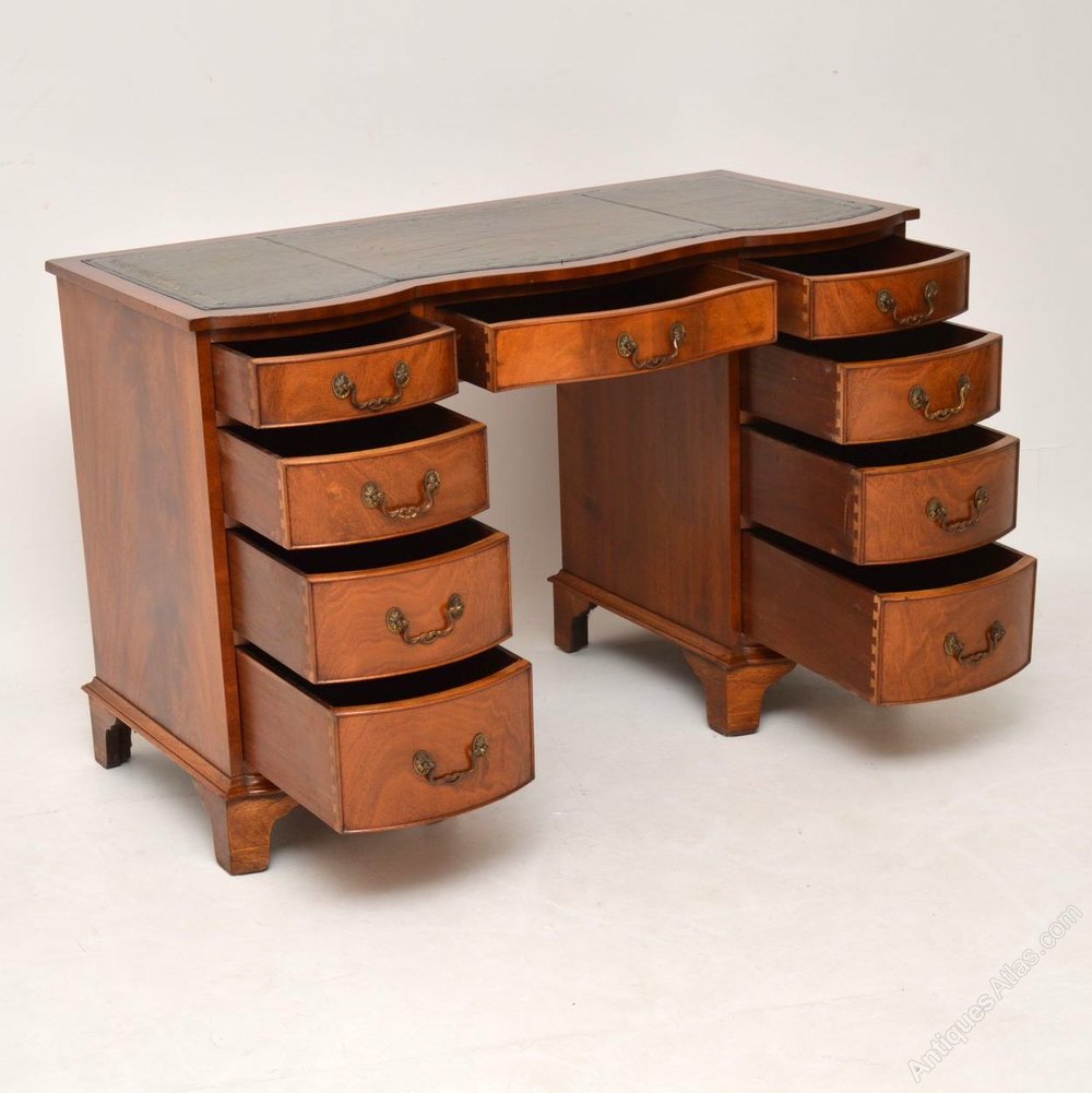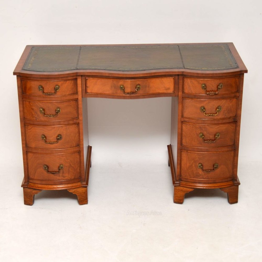 It has a double serpentine shaped front & drawers of graduated depth with beautifully cast brass handles. This desk sits on bracket feet & the back is finished off as nice as the front & sides. It also has a generously wide kneehole space for a desk of this size.