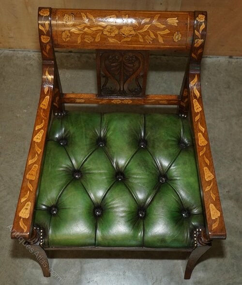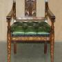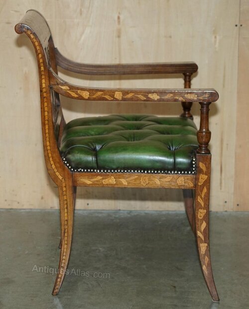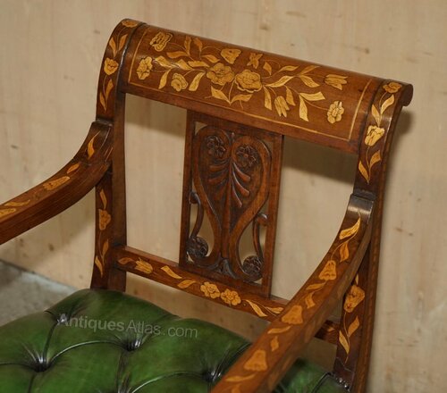 We are delighted to offer for sale this Important, Fully Restored hand made circa 1850 Dutch Marquetry Inlaid desk chair with green leather Chesterfield Tufted seat