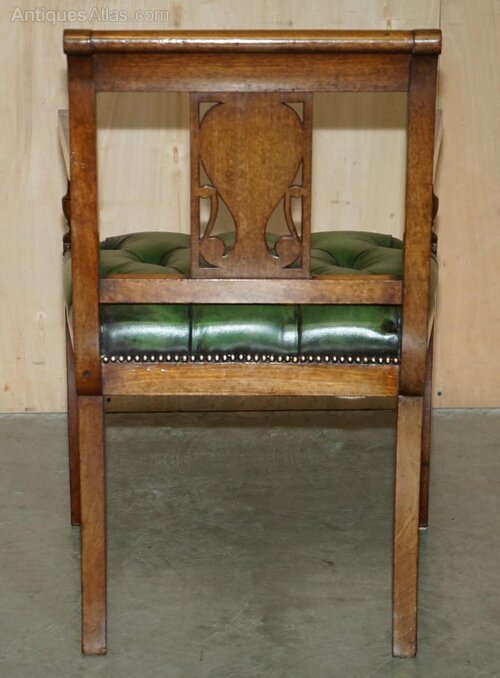 Restoration wise it has been on a journey, the frame has been sympathetically washed back and French polished being sure to keep all the original age related patina, the leather seat pad is new Italian leather, its upholstered plain, hand dyed six times, antiqued, sealed waxed down and polished