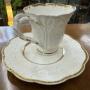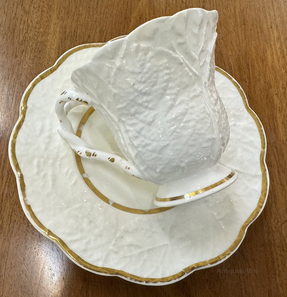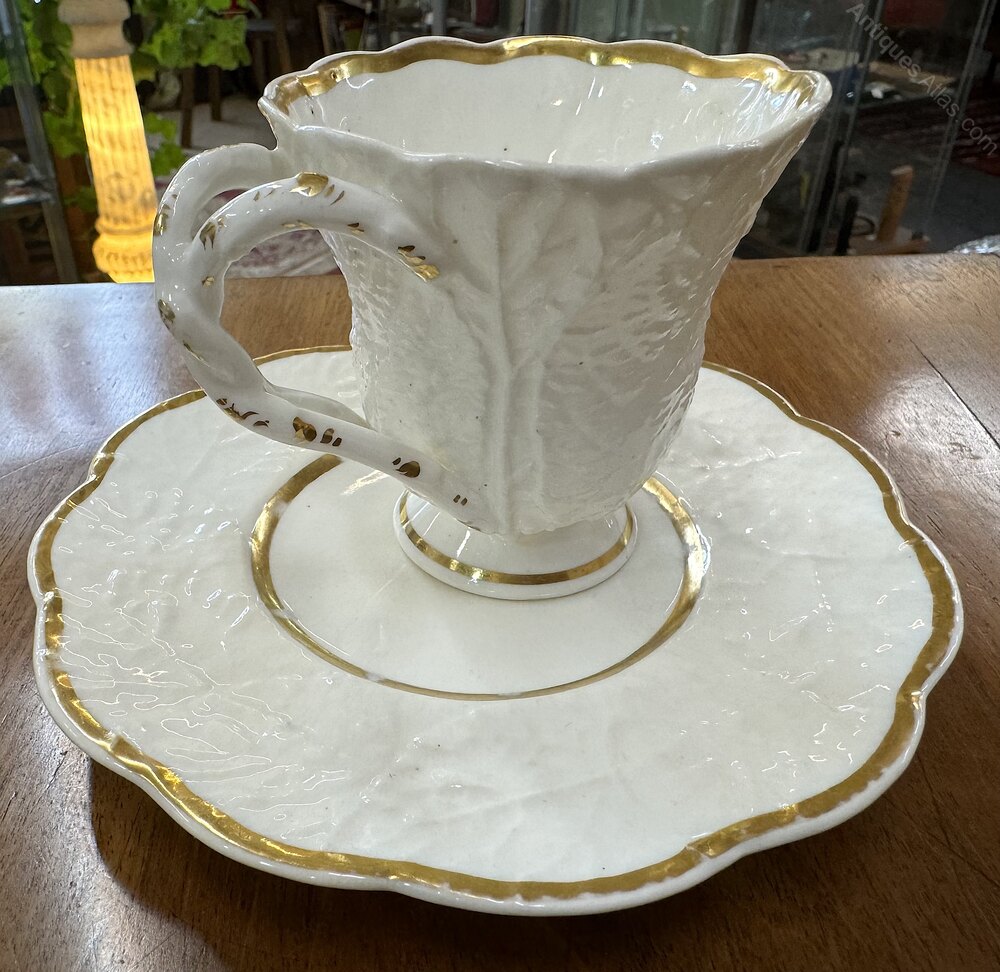 This rather rare Rockingham Primrose Leaf pattern (pattern No 655) cup and saucer consist of a body decorated with primrose leaf moulding extending to a lovely twisted crossover stem handle. The cup and saucer is minimally decorate with gold bands to the saucer and cup along with gilt highlights to the handles, which would have allowed users to admire the fineness of the pure white moulding. The cup and saucer are not marked to the base but the pattern is documented in 'The illustrated Guide to Rockingham Pottery and Porcelain' by D.G. Rice, 1971, page 46 and plate 97.