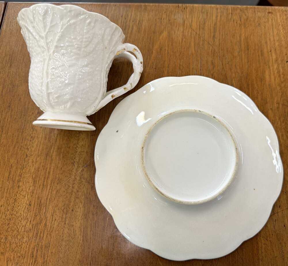 We have for sale a very hard to find example of a Rococo Rockingham Primrose Leaf pattern cup and saucer circa 1826-1830.