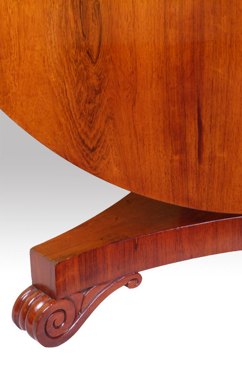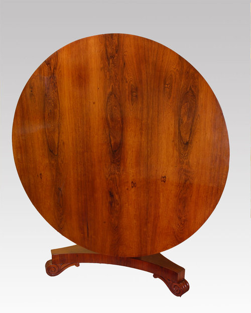 A Rosewood Tilt Top Table. The fine figured top supported on a round centre column with ring moulding leading to a triform base raised on ridged scroll feet and brass castors