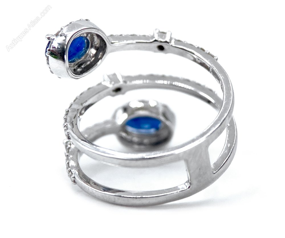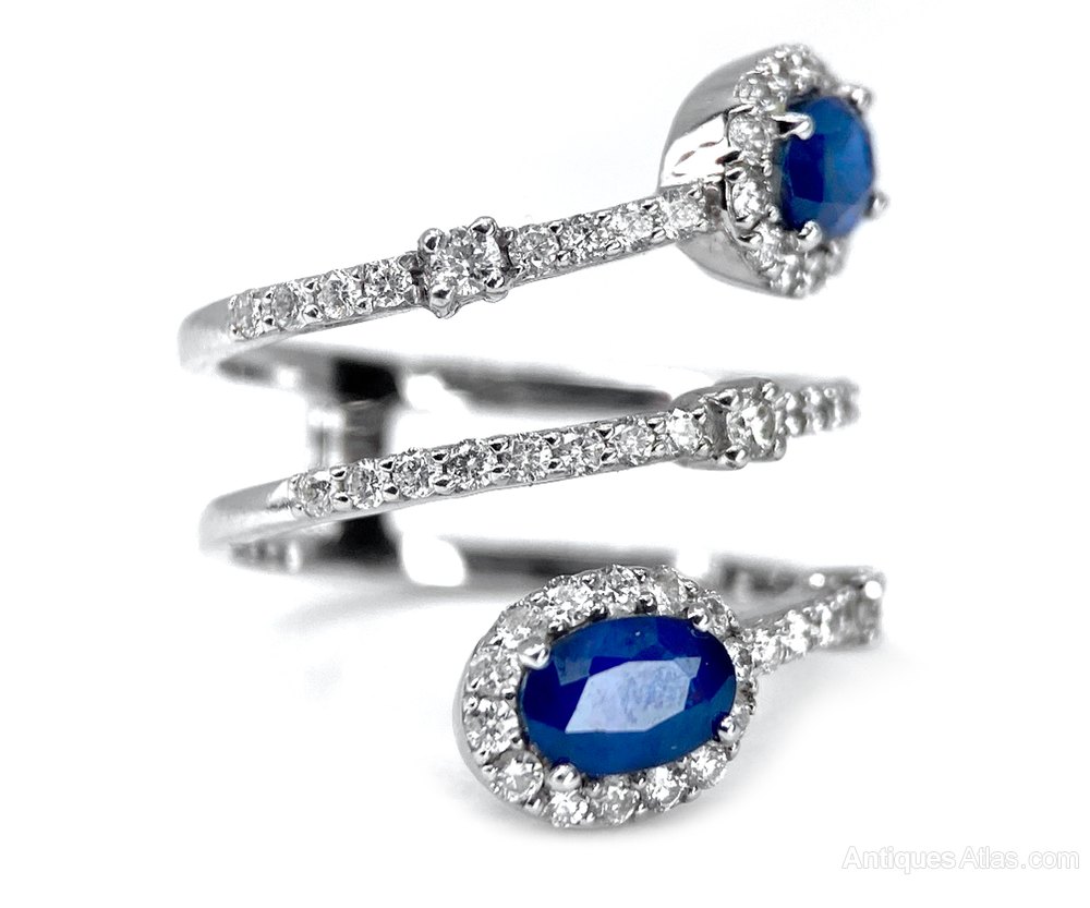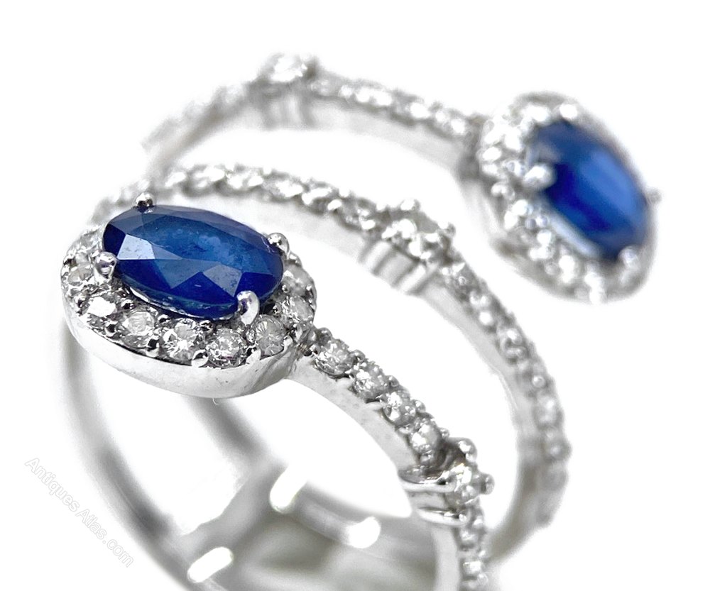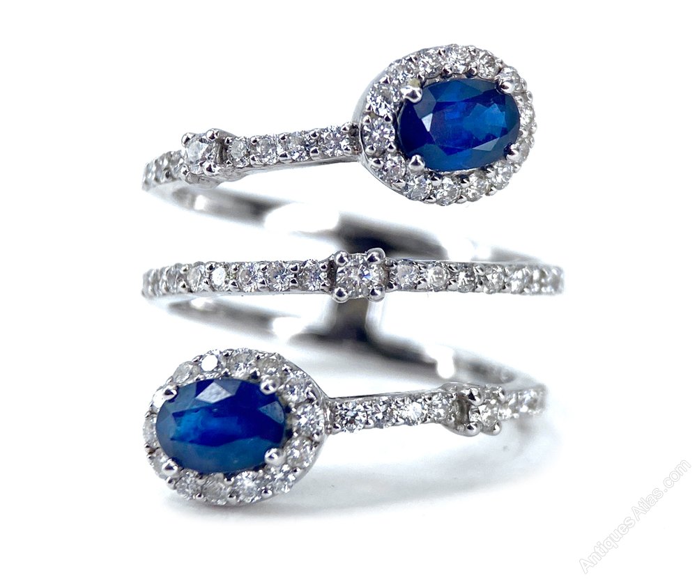 This is a smart unusual ring. The two sapphires are approximately 0.58 carats each = 1.16 carats total with approximately 1 carat of diamonds on the coil and round the sapphires.All set in 18 carat white gold. The setting measures 23.64 mm diagonally across .The ring size is L but we have a superb jeweller who can resize without a trace. Weight 5.00 grams