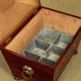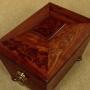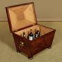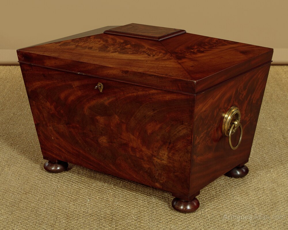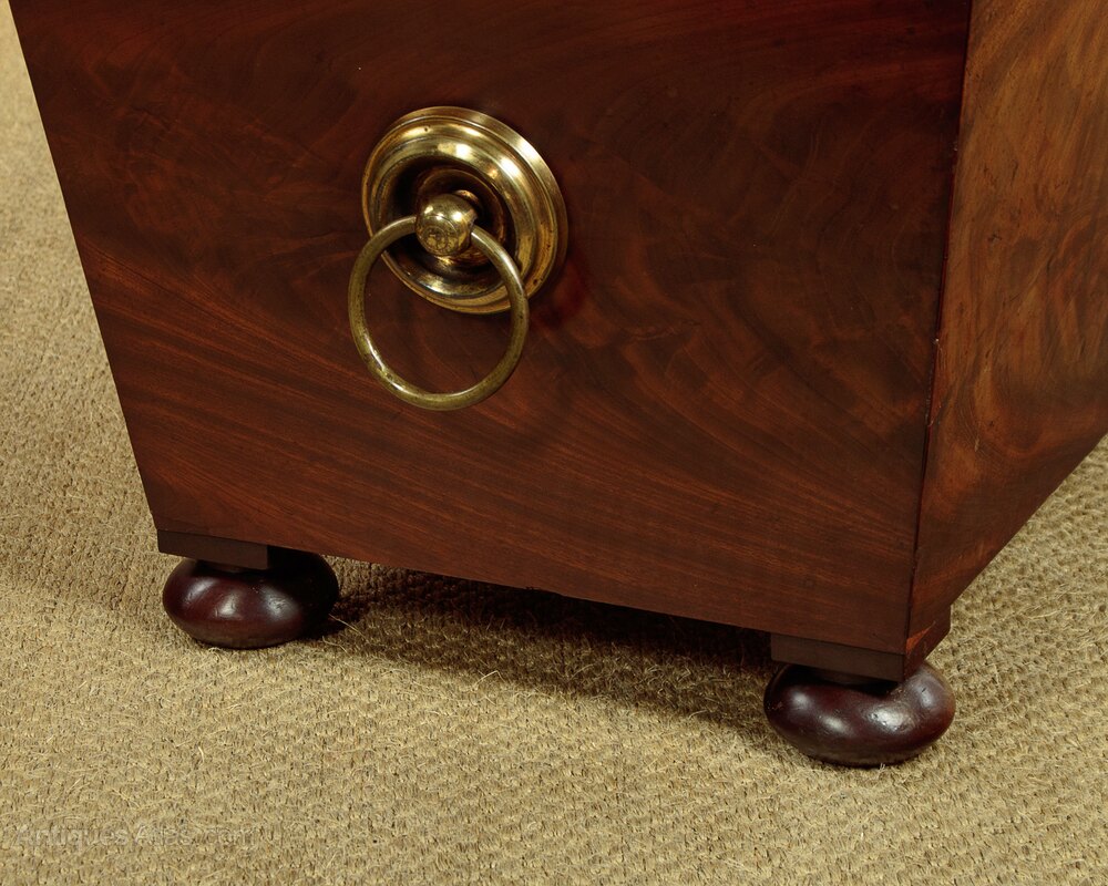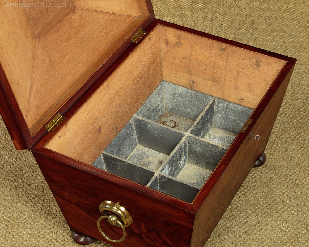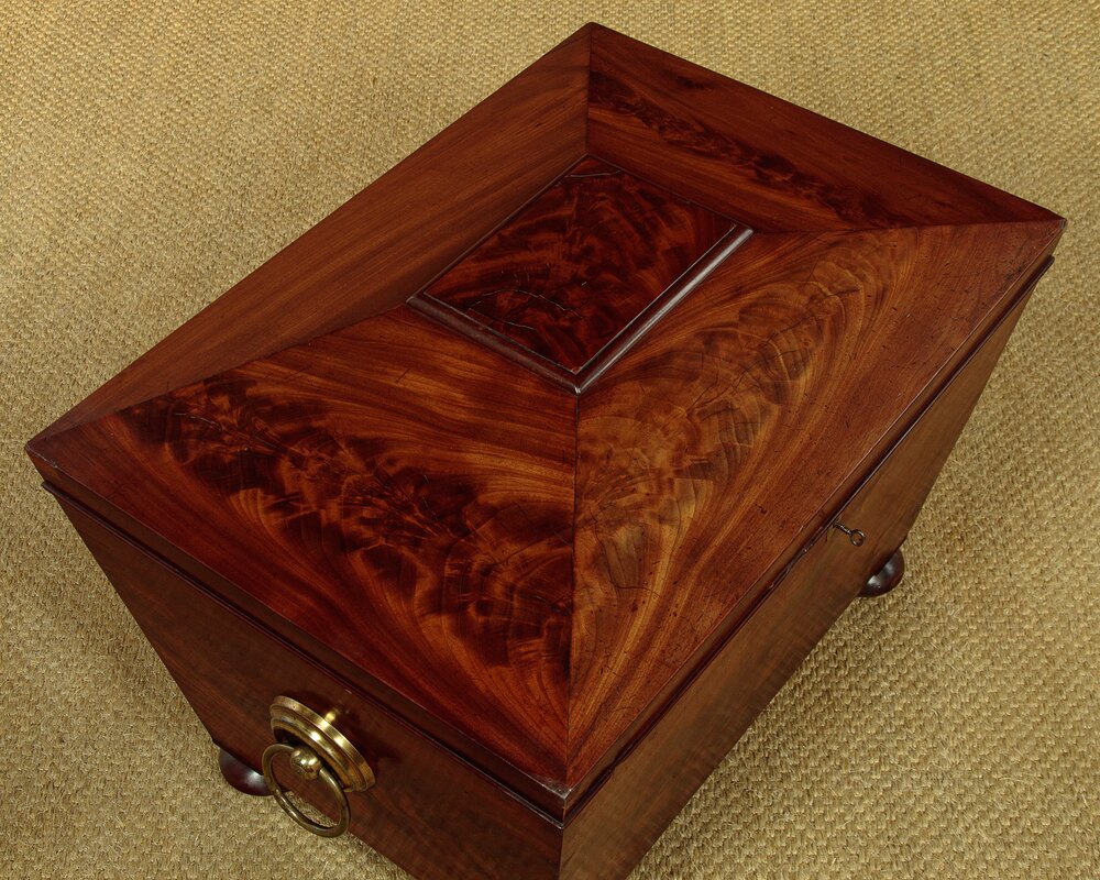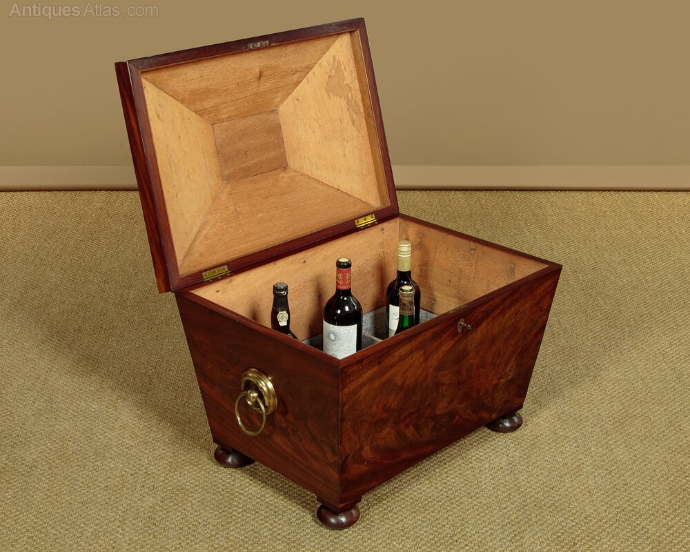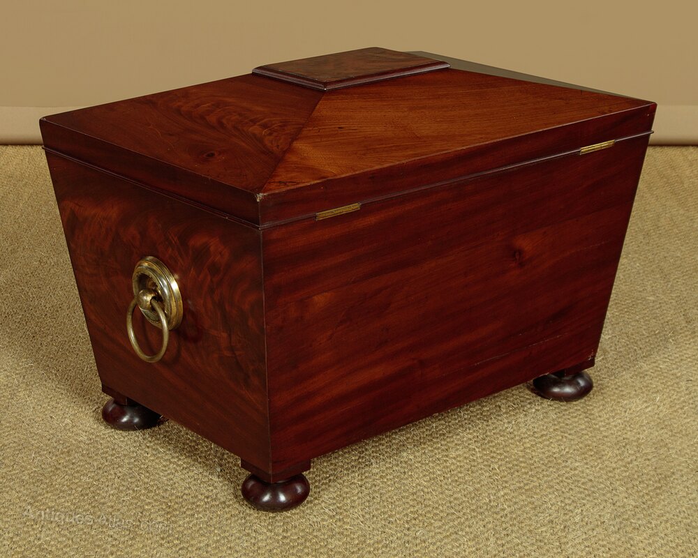Very handsome Regency era mahogany cellarette or wine cooler c.1830. Of Classical tapering sarcophagus form veneered in well figured flame mahogany and retaining the original large brass handles at the sides. Open the lid to reveal the original lead covered dividers inside to stand six large bottles (internal height 13"). Original working lock with inlaid brass escutcheon, original brass hinges. Raised on turned bun feet. Some minor wear and repairs to the veneers, generally excellent colour and condition, cleaned and waxed in our workshops. Key supplied.