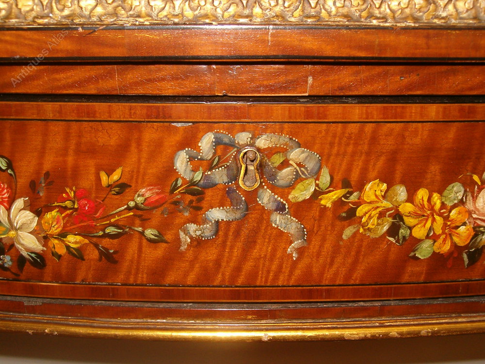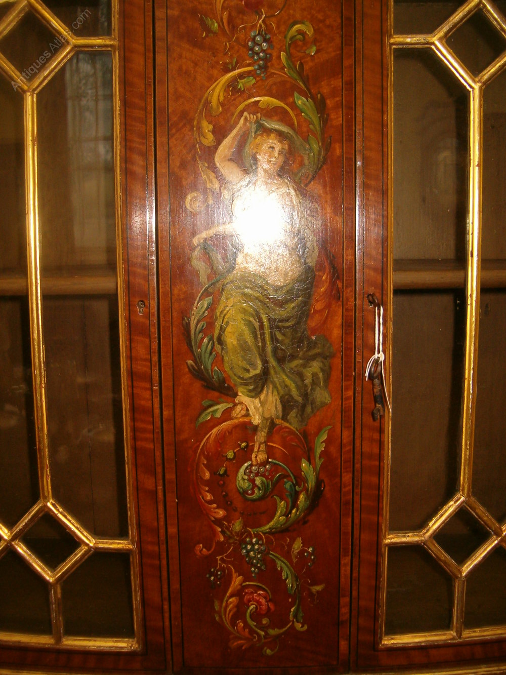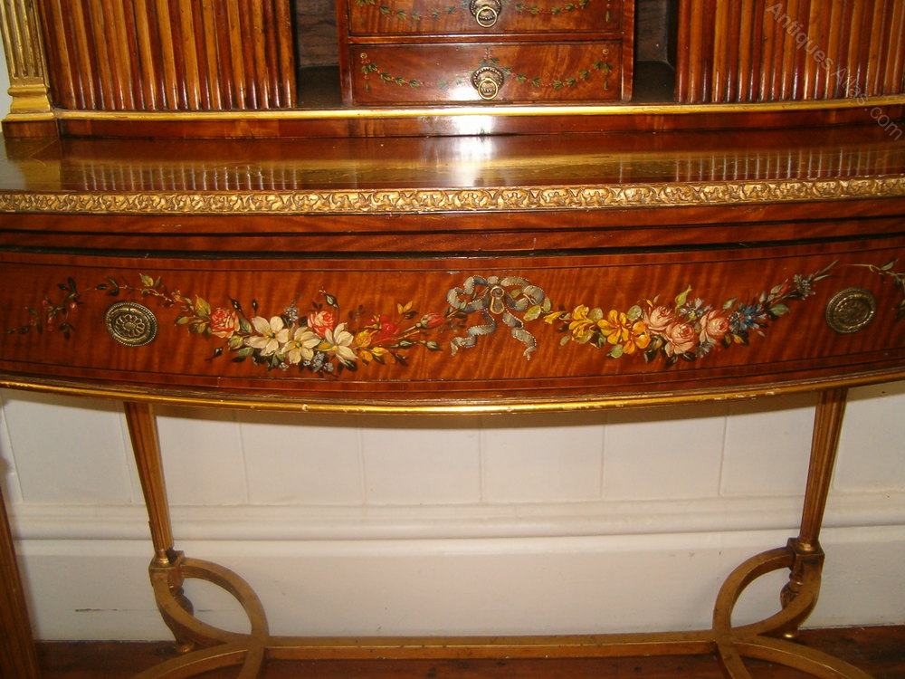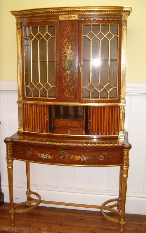 A late Victorian cabinet of Sheraton design profusely gilded and decorated with painted maiden and floral swags. The upper section has a tambour front surmounted by a glazed cabinet. The lower section has a frieze drawer over baluster turned legs with shaped stretchers.