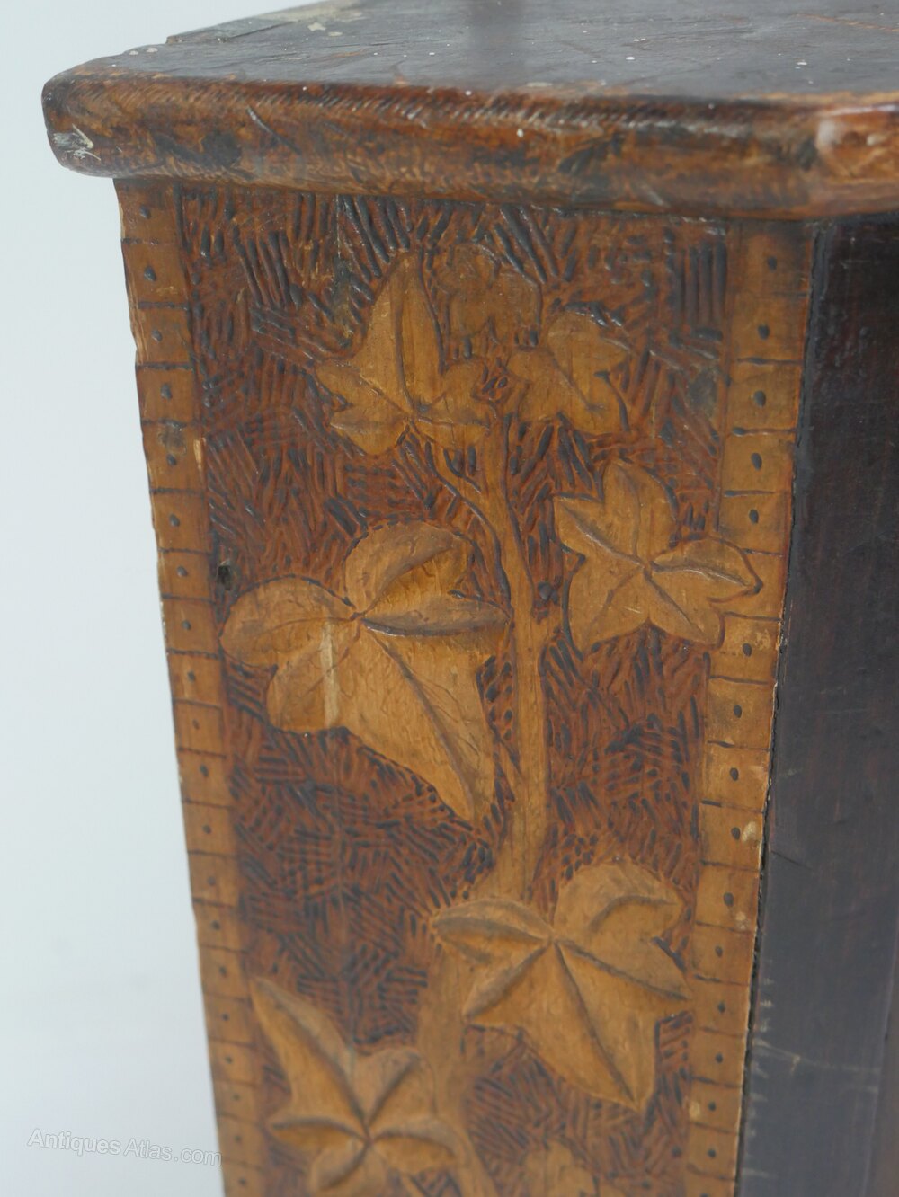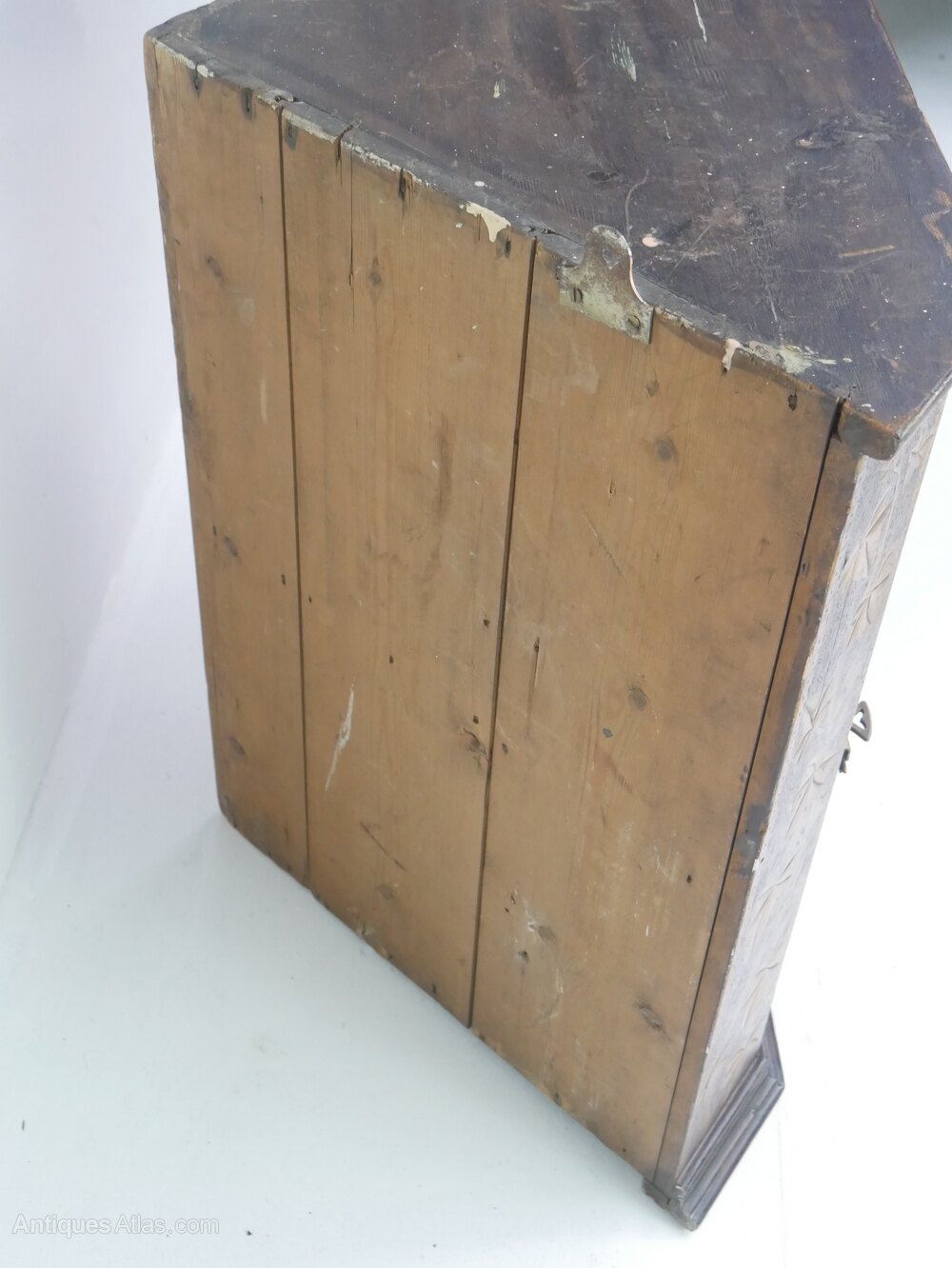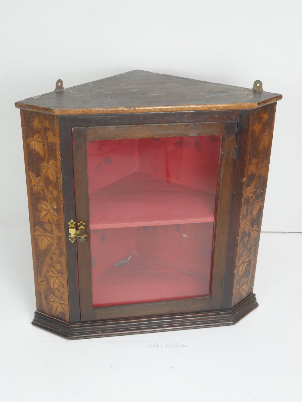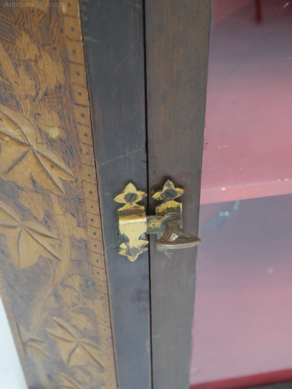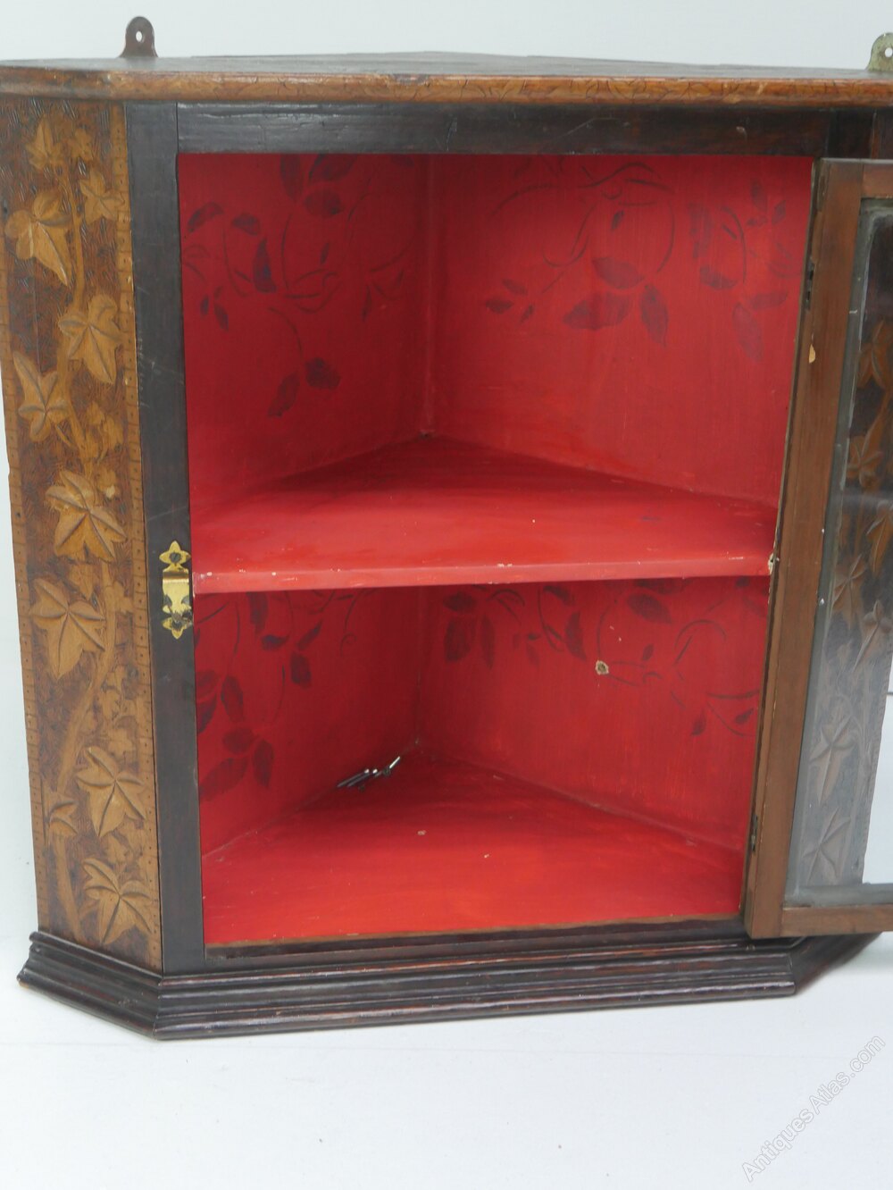 A charming Scottish vernacular poker work wall cupboard made in the large 19th century, leaf pokerwork decoration to each side, a brass catch opening to a single shelf. In good usable condition, made around 1890-1900, the side width is 41.5cm and all ready for use.