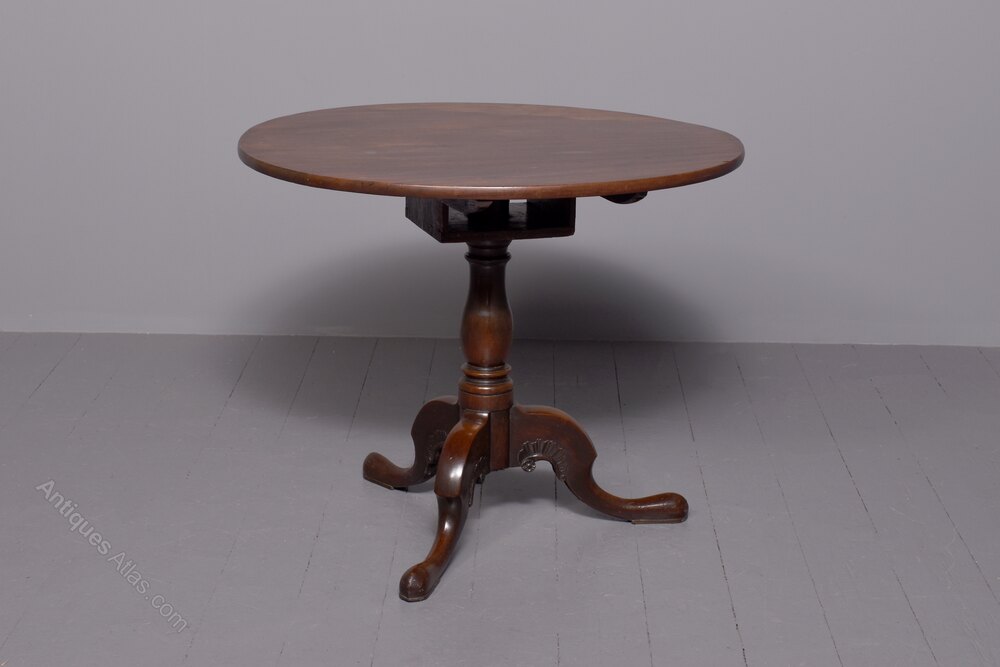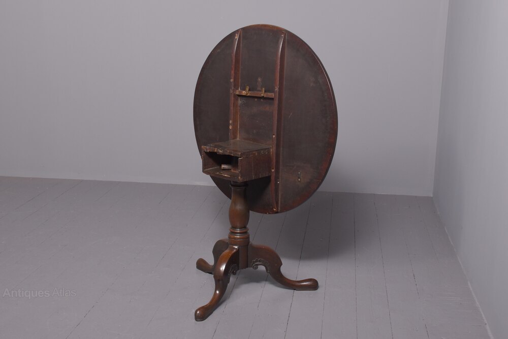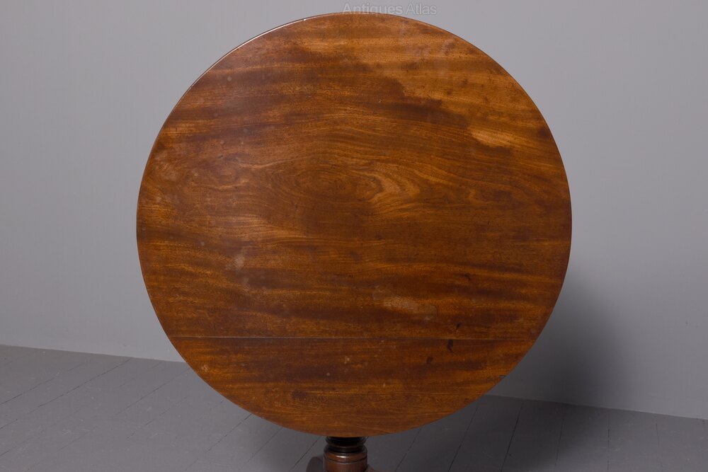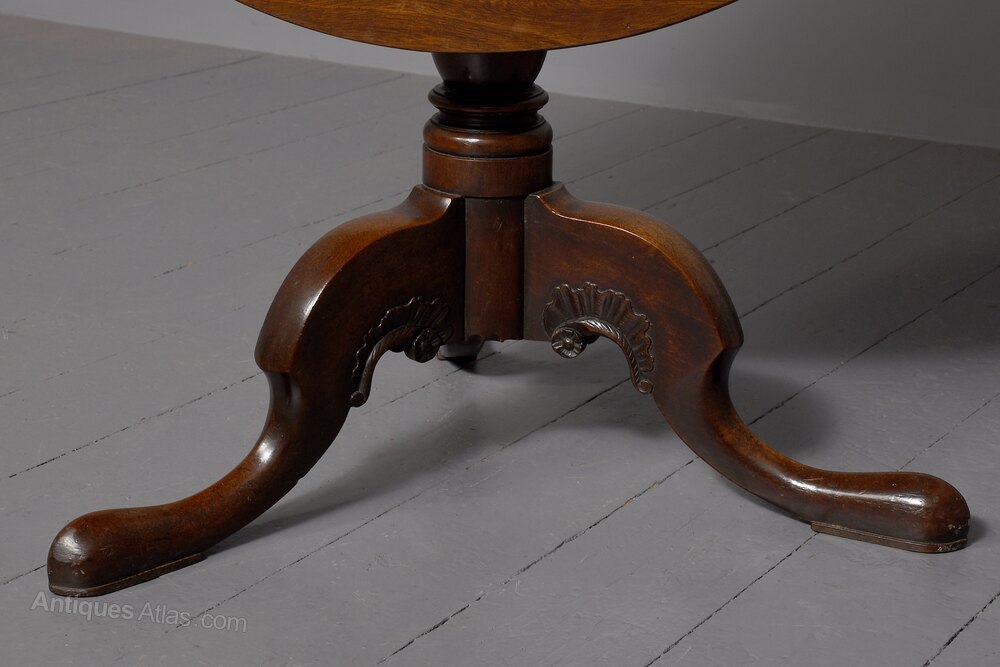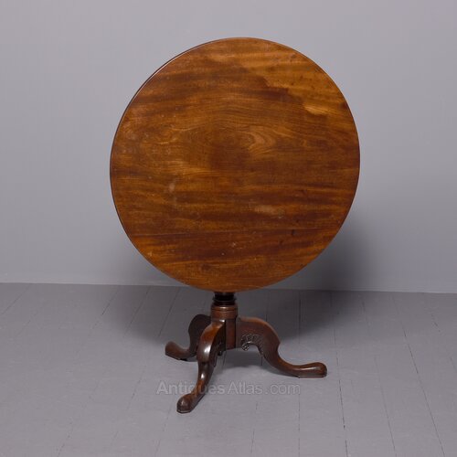 Circa 1750. A rare late George II Scottish mahogany circular occasional table, the top with wonderful flame mahogany, supported on a stylish dove tail box base with a removable pin, the top can revolve, resting on a classic bulbous stem issuing three hipped cabriole legs with foliate carving to the underside including flower heads and leaves and finishing on an extended pad foot with a slight raise on the top.