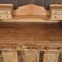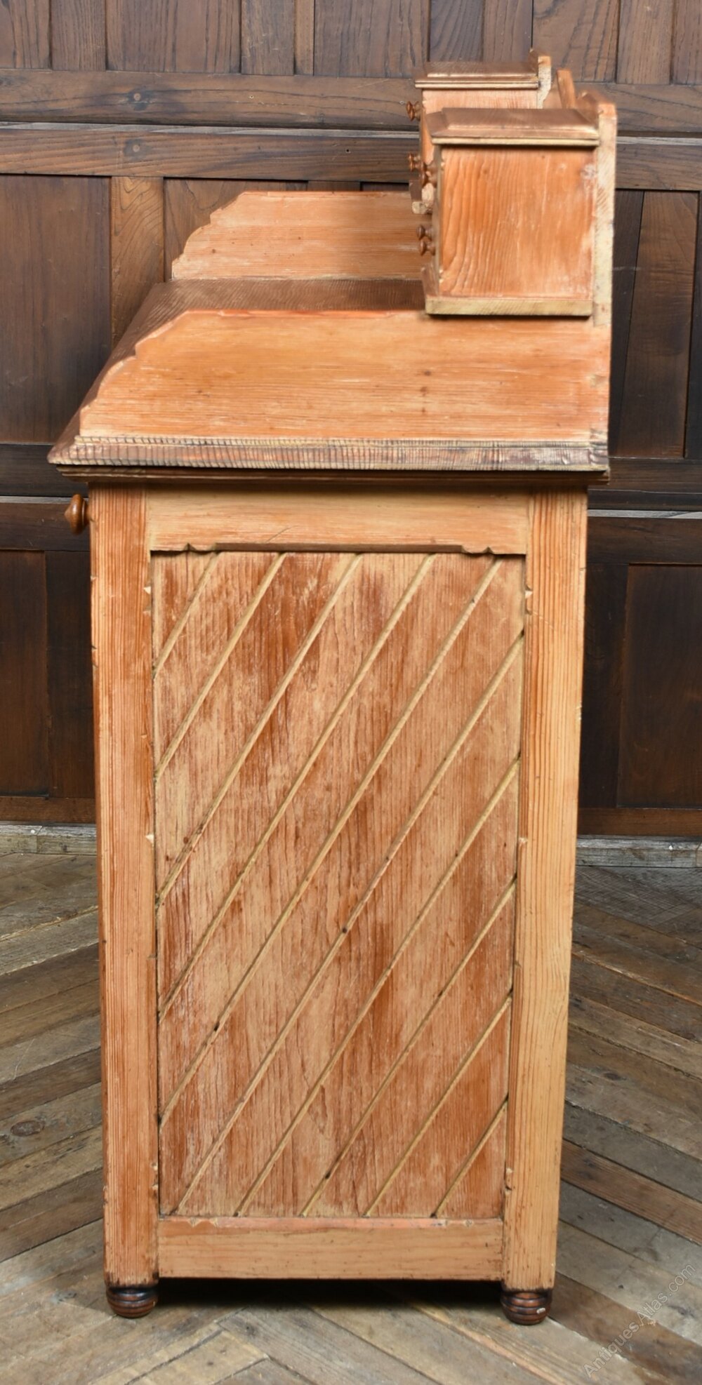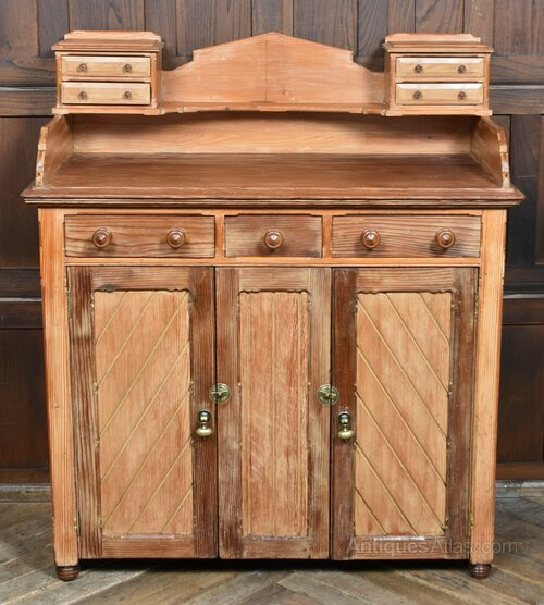 A beautifully proportioned Scottish Victorian kitchen dresser in solid pine, showcasing the honest craftsmanship and utilitarian charm of late 19th-century rural furniture. The natural finish highlights the warm grain and mellow patina of the wood, with subtle wear that speaks to its long domestic history. The upper section features twin banks of small drawers—each with original turned wooden knobs—set above a generous open shelf. The shaped backboard adds a gentle flourish to the otherwise practical form. Below, three drawers sit above a trio of panelled cupboard doors, each with distinctive diagonal and vertical plank work. Two doors retain their brass drop handles and brass swing bar locks. The interior offers ample storage, making this piece as functional as it is characterful. Standing on short, sturdy feet and built to last, this dresser is a fine example of Scottish furniture.