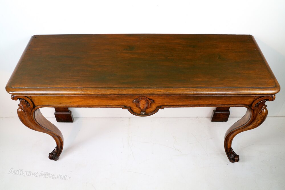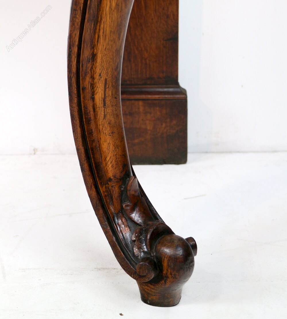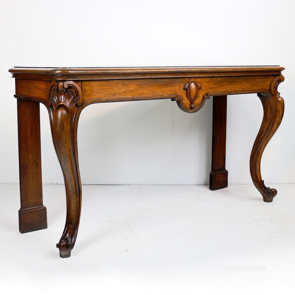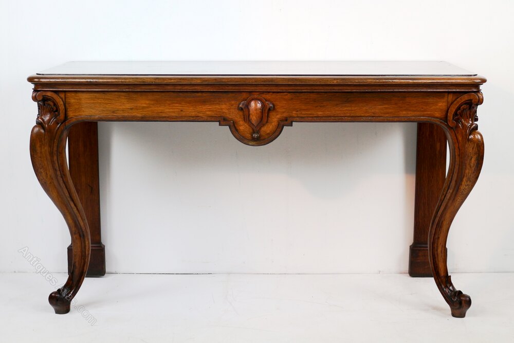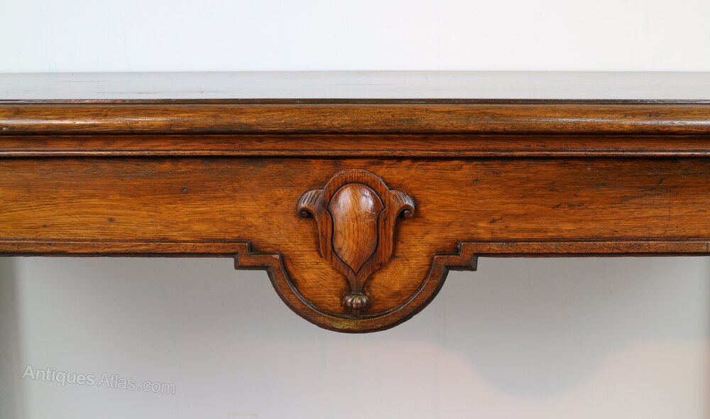 A large Scottish William IV oak hall or serving table dating to the early 19th century, circa 1830. With a moulded rectangular top above a shaped frieze with central shield cartouche and raised on well carved cabriole legs to the front with leaf carved scroll feet. The slim design of the back legs and the overhang to the top allow this piece to sit flat to the wall. A good solid country house style console table in a rich golden colour, with minor character marks consistent with age and use including dark marks and bruises to the top and two screw holes to the back of either side which do not detract from the overall look but can be filled.