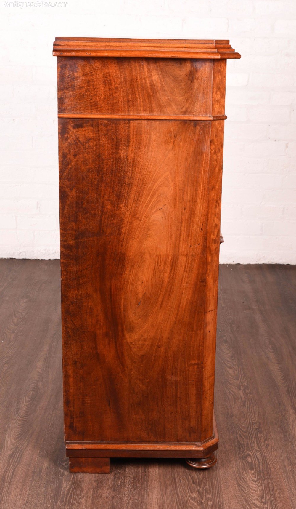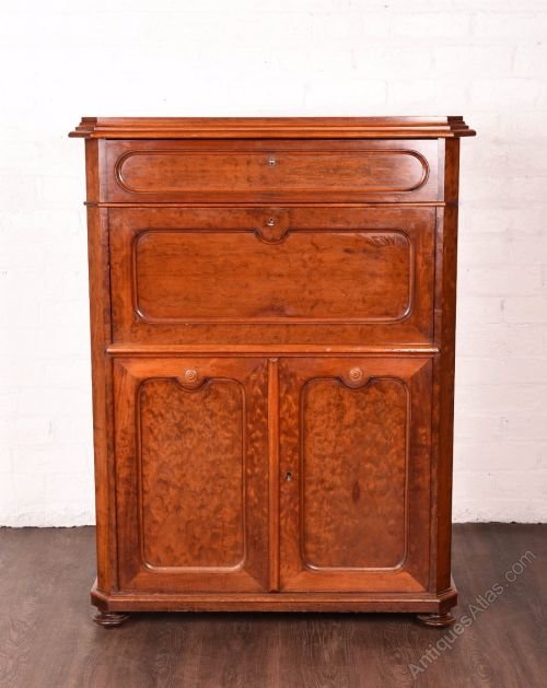 Charming Secretaire Abattant desk with a fall front which opens to reveal a baize inlaid writing surface and fitted interior featuring numerous oak lined stationery drawers and a locking central cupboard. There is a lockable drawer in the frieze and 3 oak graduating drawer in the cabinet underneath the bureau providing ample storage for your home office. The fronts of the drawers and cupboard in the bureau is covered in the same stunning mahogany veneer as the outer finish and is a wonderfully colour.