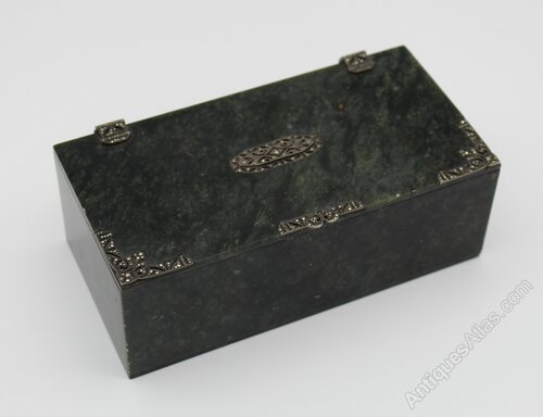 Beautiful box. Serpentine stone - translucent, green. Set with marcasite panels, in silver coloured mounts (no visible markings). Hinge in good order, minor sideways movement. 16cm wide, 8cm deep, 5.5cm high. Some "stones" missing, although not immediately noticeable. More photos available on request. Only very minor chips to edge of box, no major damage. Scratches and wear to base in line with age.