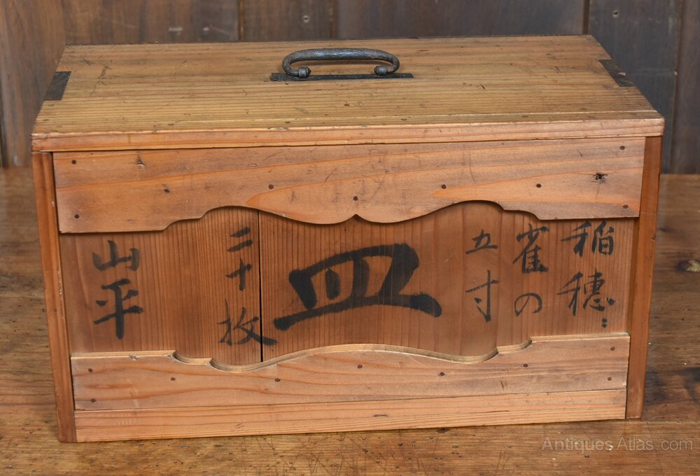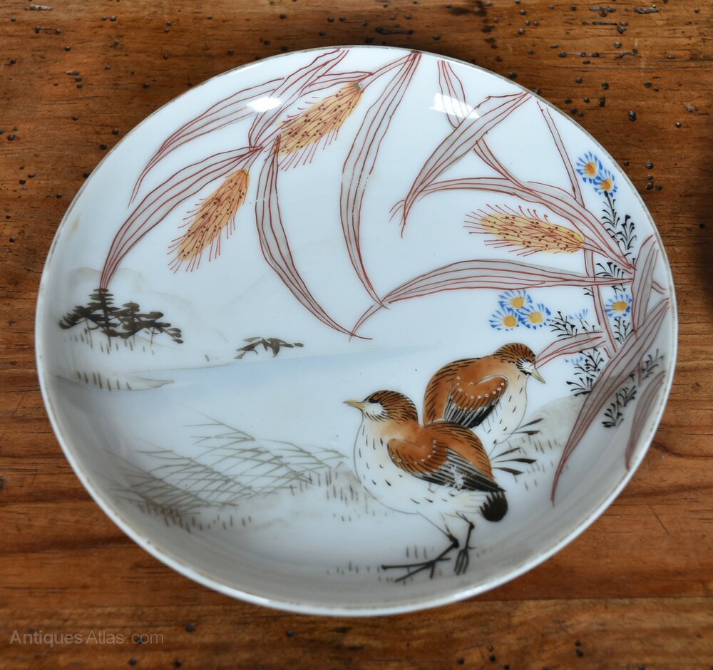 A beautifully presented set of eighteen Japanese porcelain plates, each measuring 15cm in diameter and housed in their original compartmentalised wooden storage box. The plates are delicately hand-painted with serene scenes of birds among grasses and wheat stalks, rendered in soft earthy tones with fine brushwork and subtle shading. The imagery evokes a quiet harmony with nature, typical of traditional Japanese aesthetics. The box itself bears calligraphic inscriptions and is divided into two protective compartments, with each plate carefully wrapped for preservation. A rare and complete ensemble that combines artistry, functionality, and cultural resonance—ideal for collectors or those seeking refined tableware with a story.