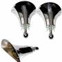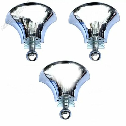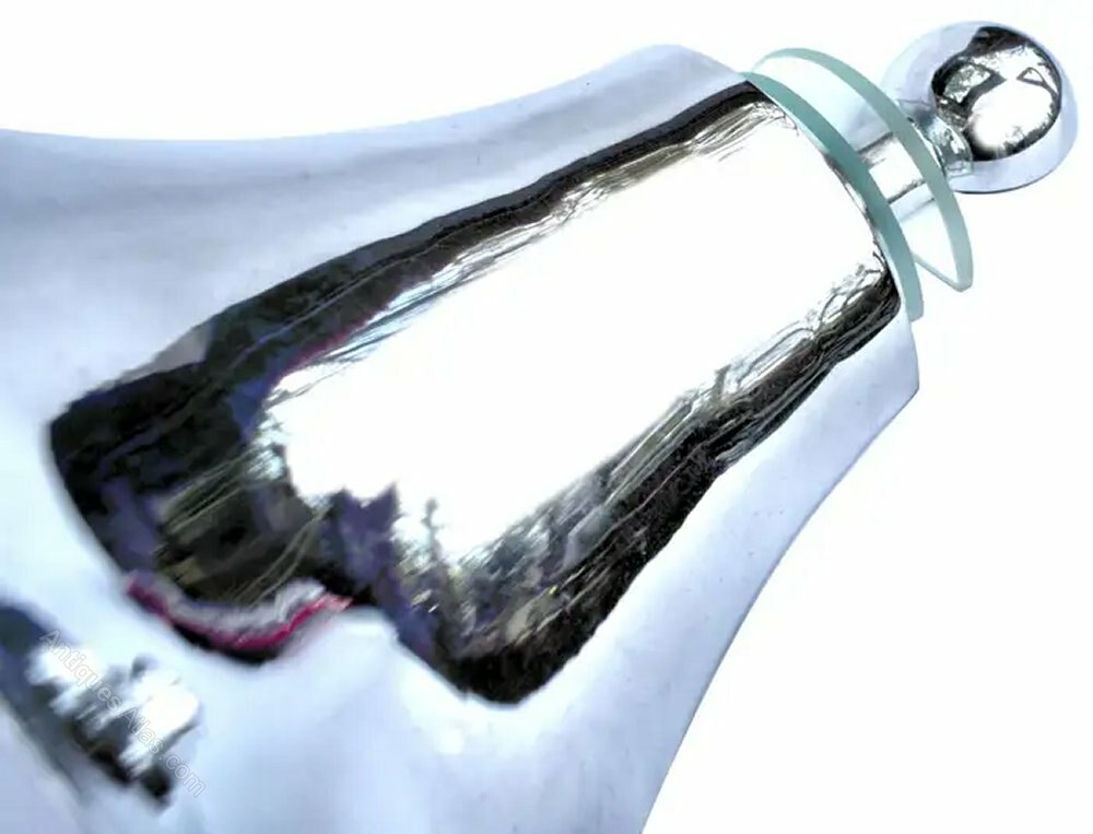 Superb set of three Art Deco wall lights. A chrome globe leads to two glass demi-rondelles which in turn lead to a large chrome trumpet which forms the up-lighter shade. Very simple and very stylish, the photos really don't do them justice. The condition is very good for the age, there is the odd mark of wear but nothing to distract. These lights are fairly substantial in size and most likely would have come from a cinema. Ideal for the period or Moderne home.