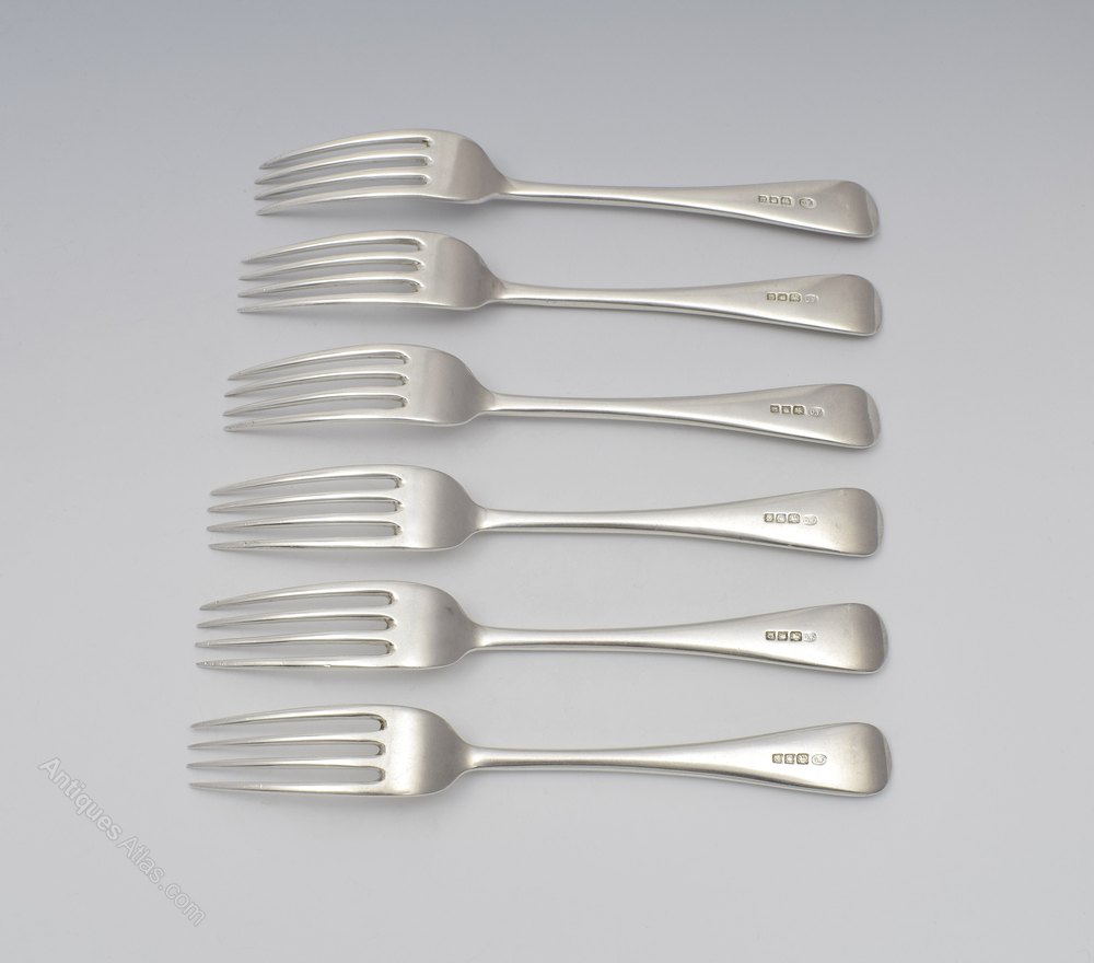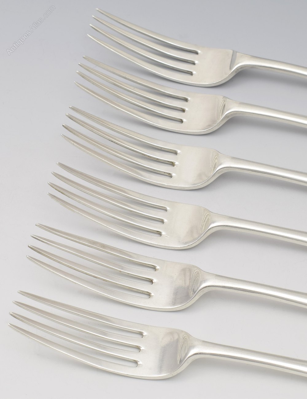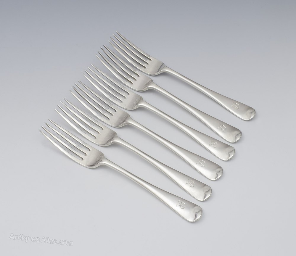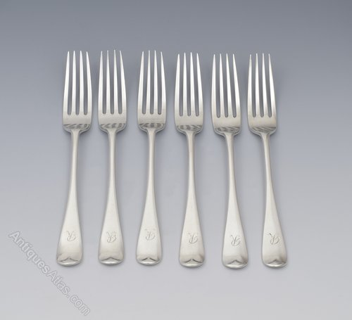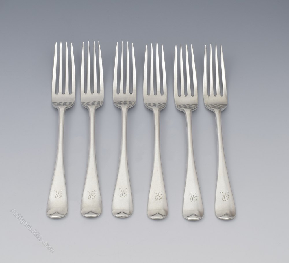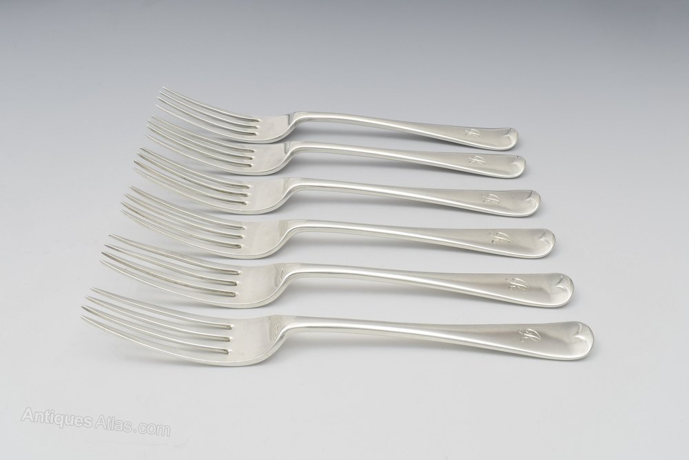 Very nice elegant set of 6 silver forks. Hallmarked for London 1918, maker Josiah Williams & Co (David Landsborough Fullerton). They have an "R" monogram to each so perfect as a gift.