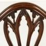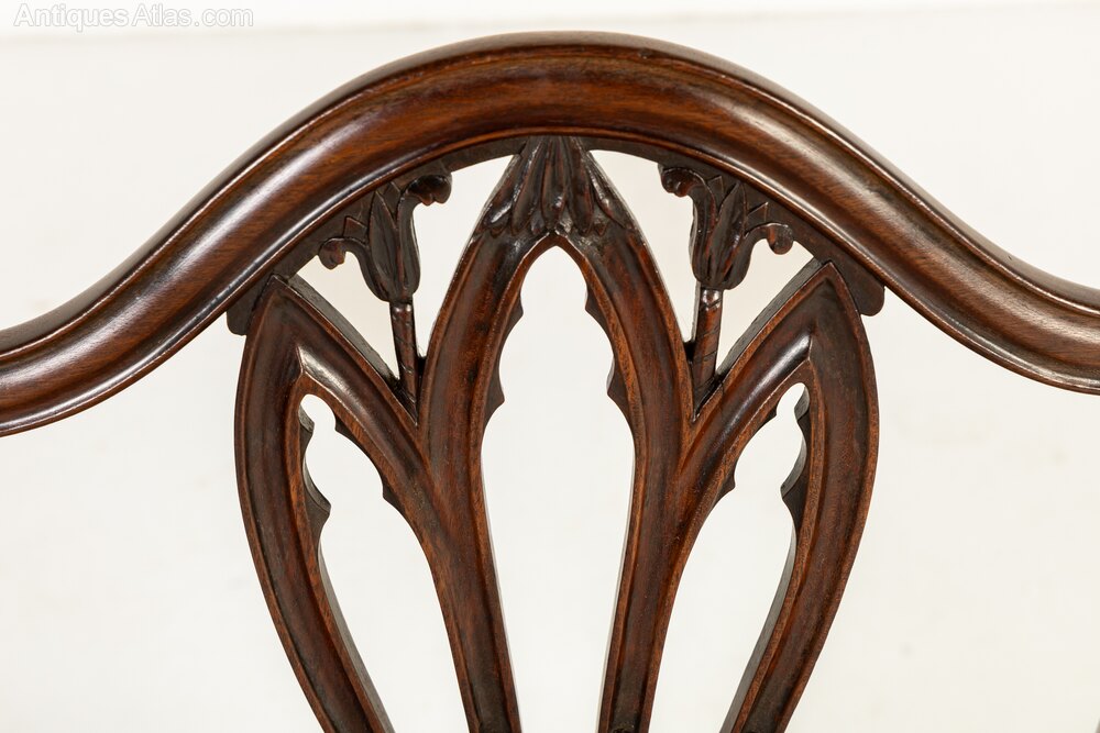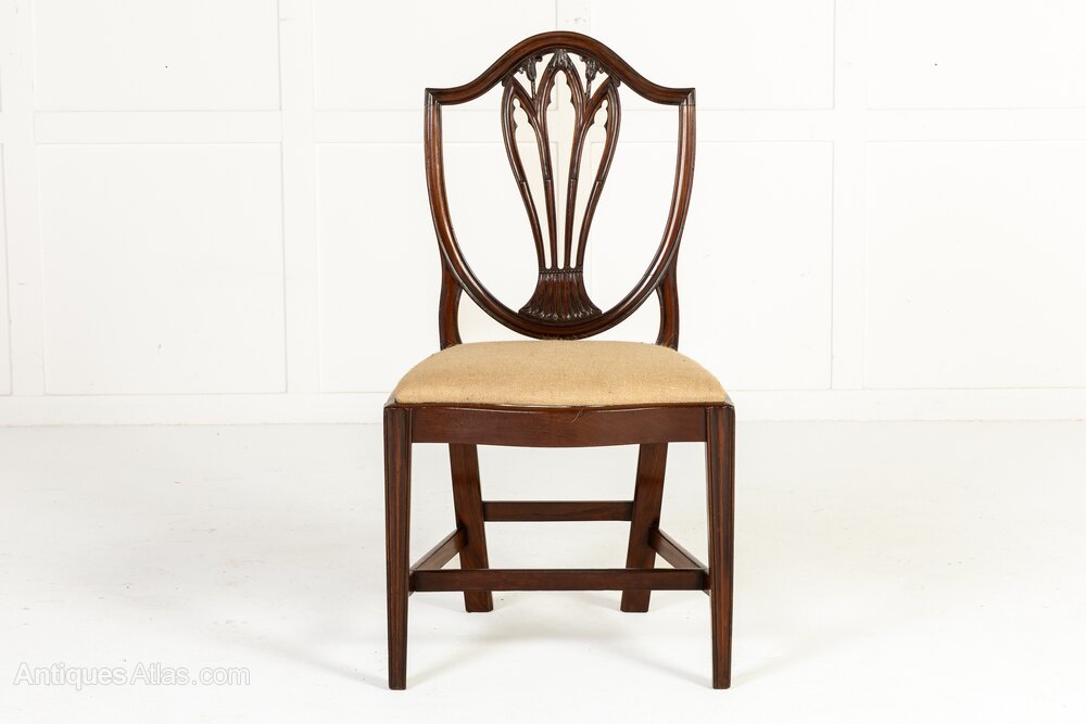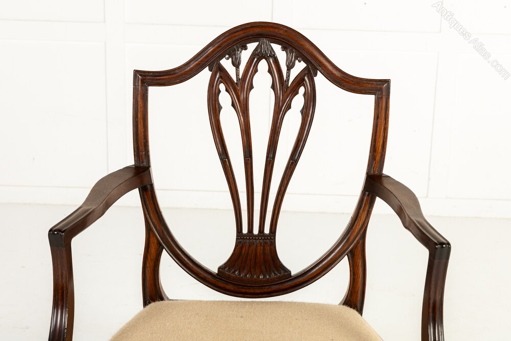 Consisting of two armchairs and six side chairs, all newly upholstered to an under finish ready for the client's choice of outer fabric. The chairs are in the Hepplewhite style, featuring shield back designs which he popularised but the tapering square sectioned legs are of Sheraton inspiration. The chairs have serpentine front rails, and simple H-stretcher bases. The front legs of the chairs are panel moulded. The backs of the chairs feature fine leaf carving and three central motifs with gothic lancet carving to them. The mahogany used throughout has good colour and patination.