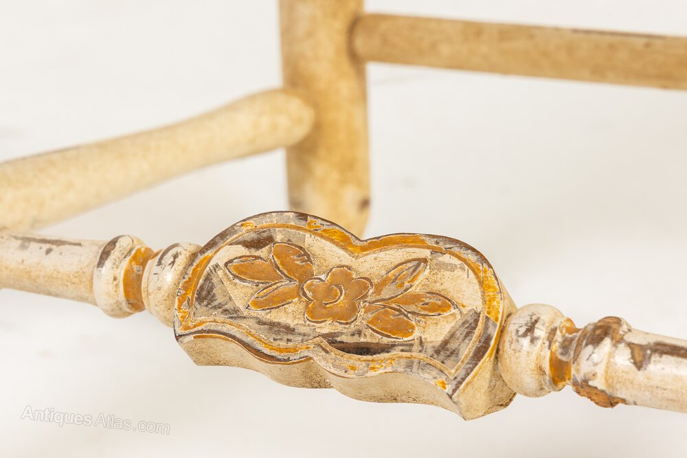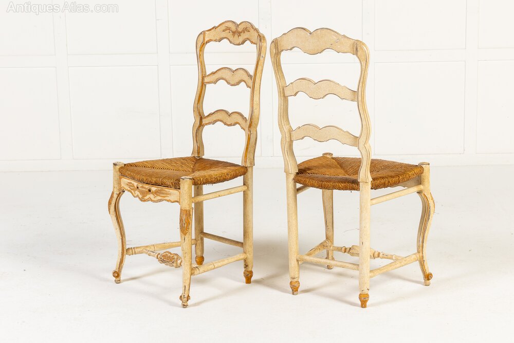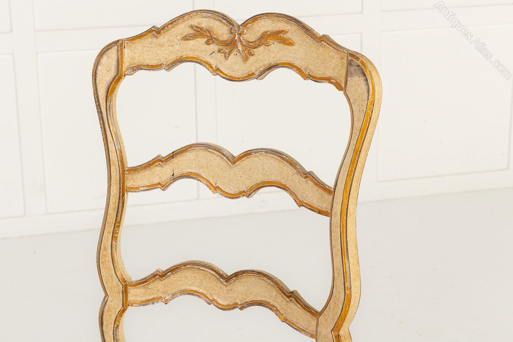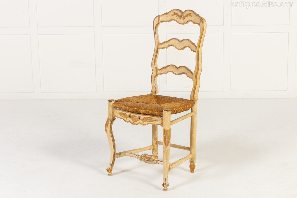 These chairs, in the rococo revival style, have rush seats and cabriole front legs, serpentine crest rails and modified ladderback-type splats. The chairs all retain their original off-white painted finish with gilded highlights and the decoration has aged beautifully, mellowing with time.