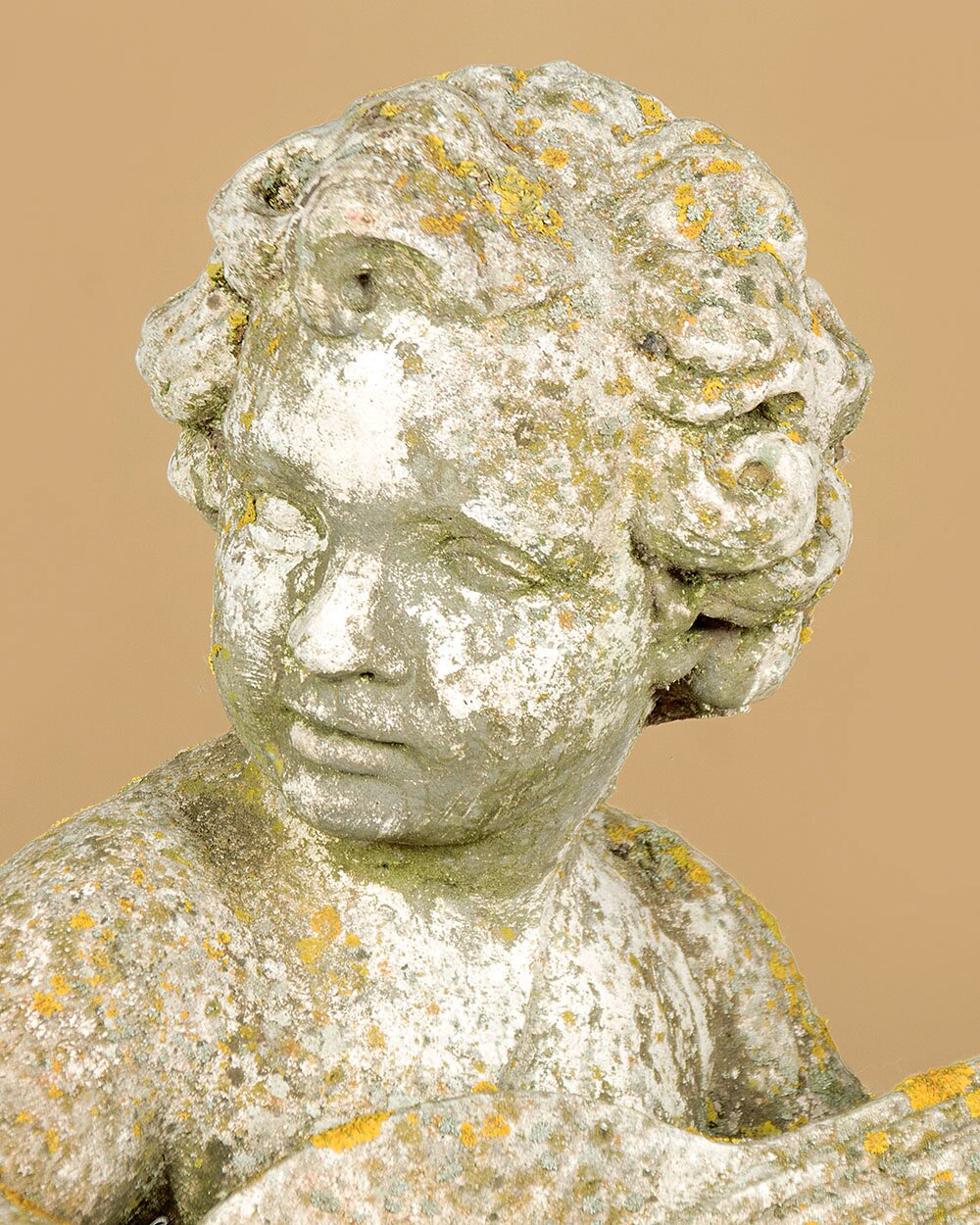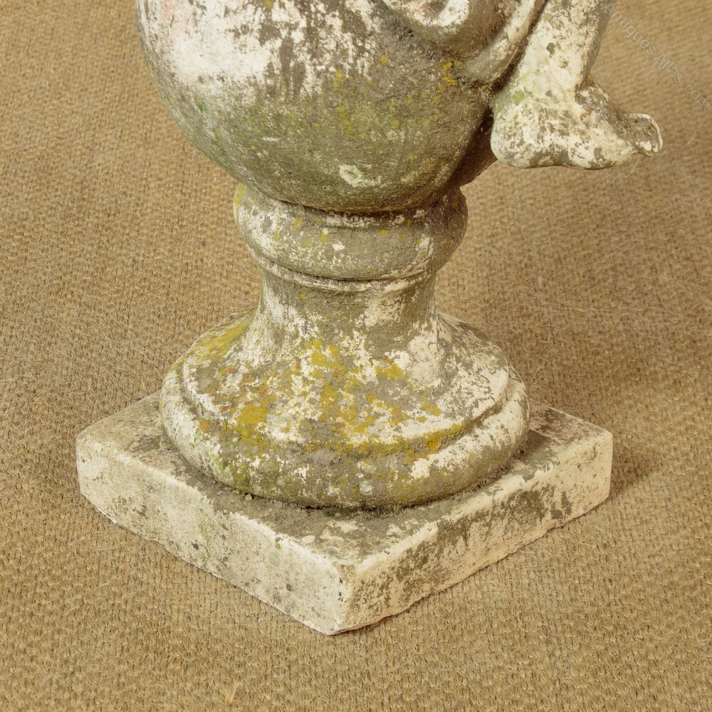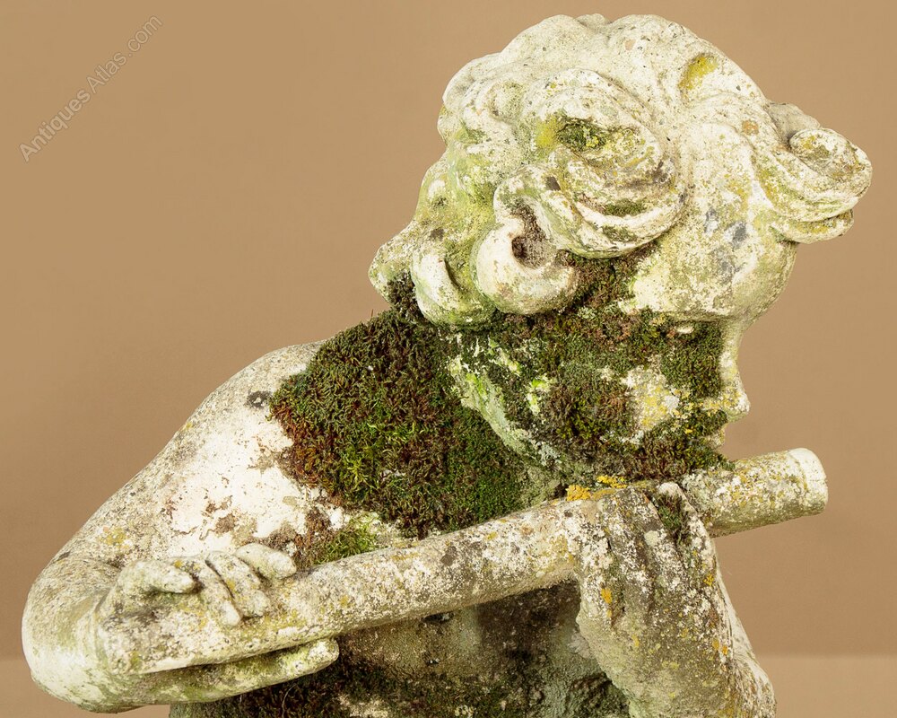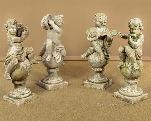 Set of four garden statues c.1960. Standing 38" tall. Modelled in reconstituted stone as Classical putti or cherubs, each playing a musical instrument (flute, guitar, cymbals and tambourine). Each sits upon a large ball raised on a circular plinth with an 11½" square base. Very nicely modelled and attractively weathered with lichen, the flute player also having a good layer of moss. Damage to the toes on one foot of the cymbal player and a break across one corner of the base of the flute player. Otherwise very good condition.