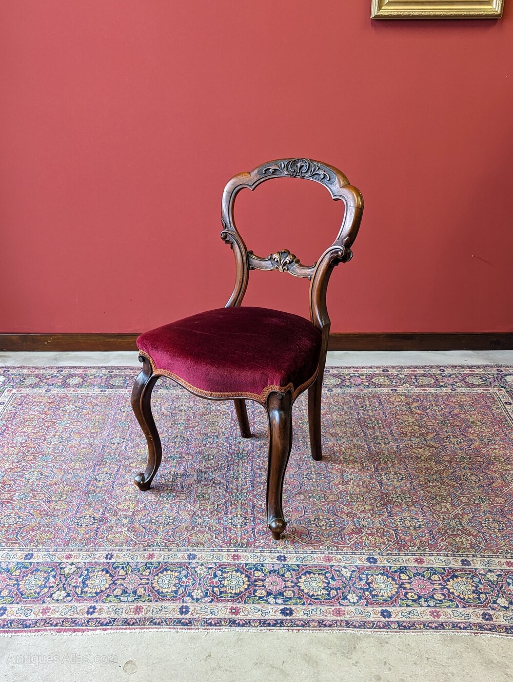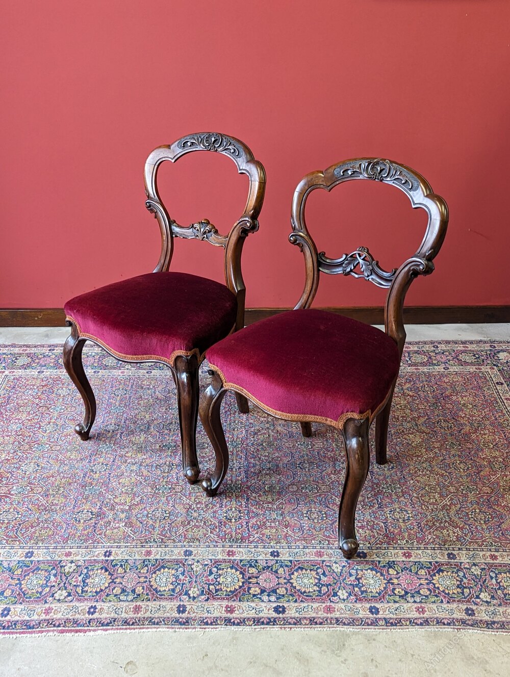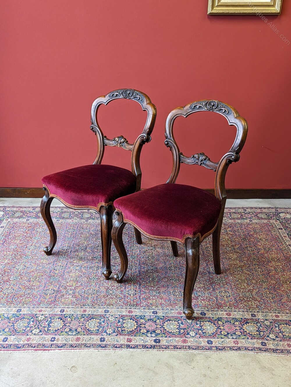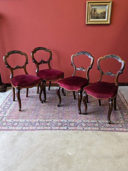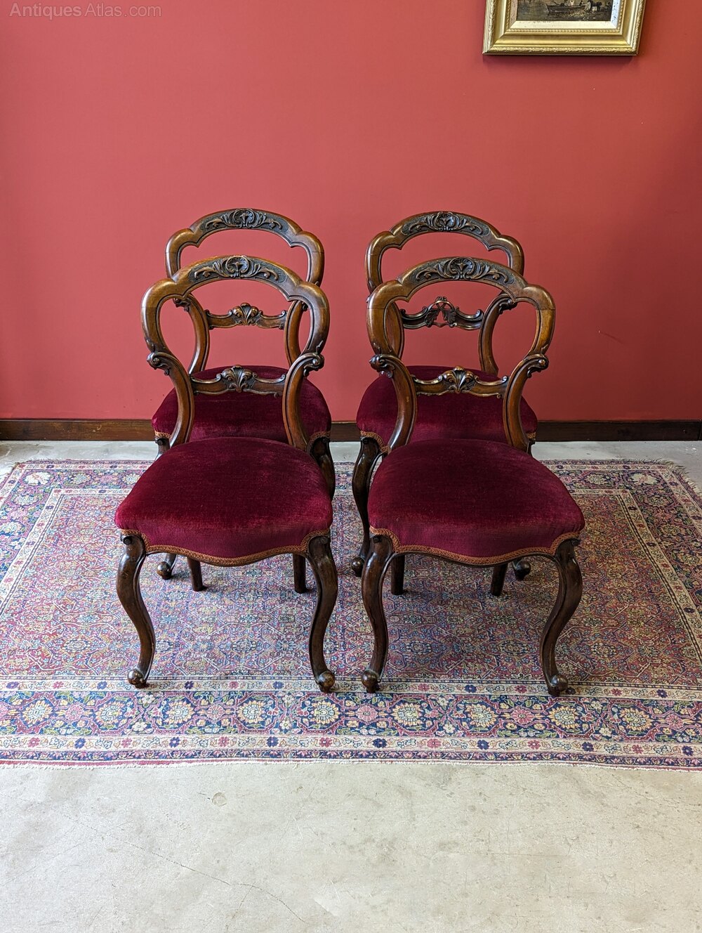A quality set of four late 19th century dining chairs with beautifully shaped and carved backs above the plush claret seats raised on carved cabriole front legs.