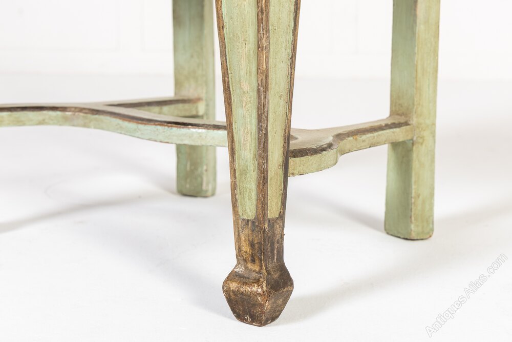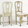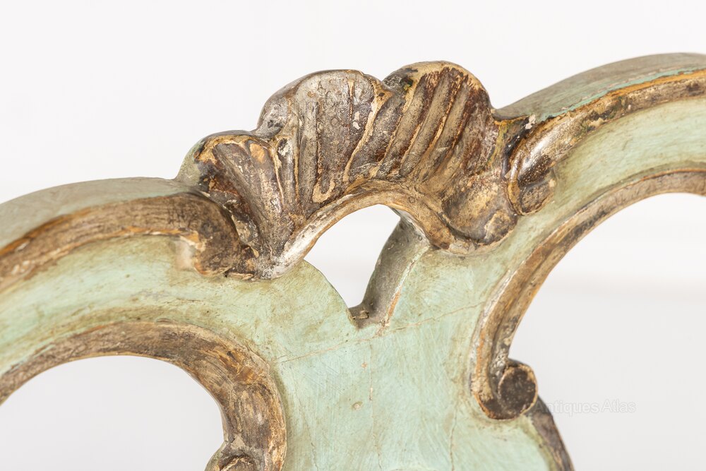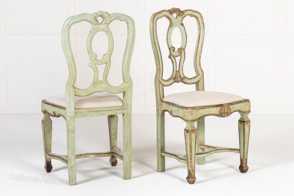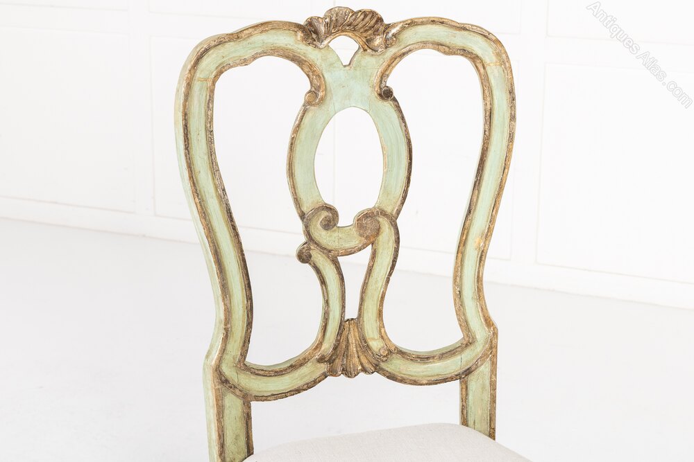 The interlaced back splats have a rococo influence, and the tapering square sectioned legs have more of a neoclassical feel. These chairs are a transitional design, produced in the third quarter of the 18th century as the fashions began to shift between the two styles and these chairs capture the best elements of each of them. The frames are well carved and refined and the chairs retain much of their original paintwork and their original patinated parcel gilt highlights on the shells, the edges of the splats and legs, and on the top side of the seat rails and stretchers.