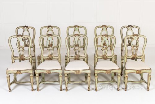 Set of Ten 18th Century Italian Painted Chairs with Original Patinated Parcel Gilding.