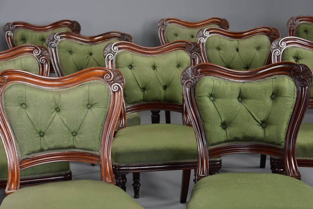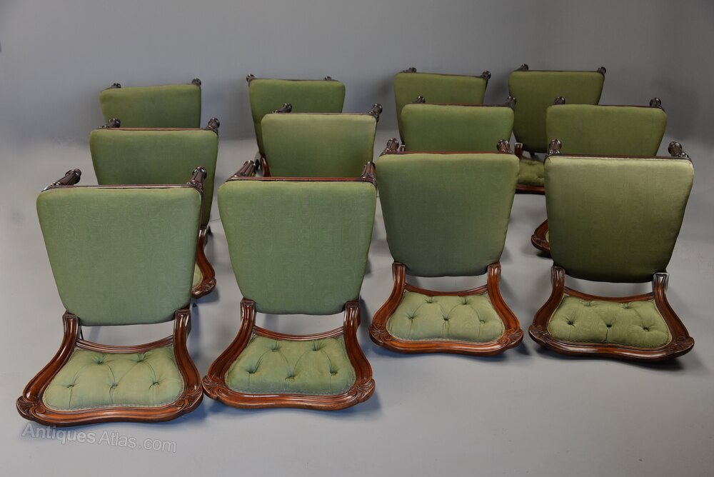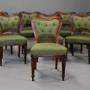 This leading down to the front legs, eight chairs having a bulbous turning to the top with a carved and tapered leg with a turned foot below, the remaining four chairs are turned to the top with a tapered and reeded leg with a brass castor below, the rear legs all of outswept design.