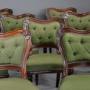 This set of chairs each consist of a moulded shaped top rail with carved fan and scroll decoration to the corners with shaped uprights and lower back rail.