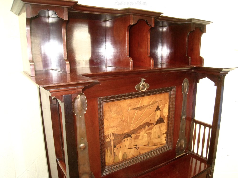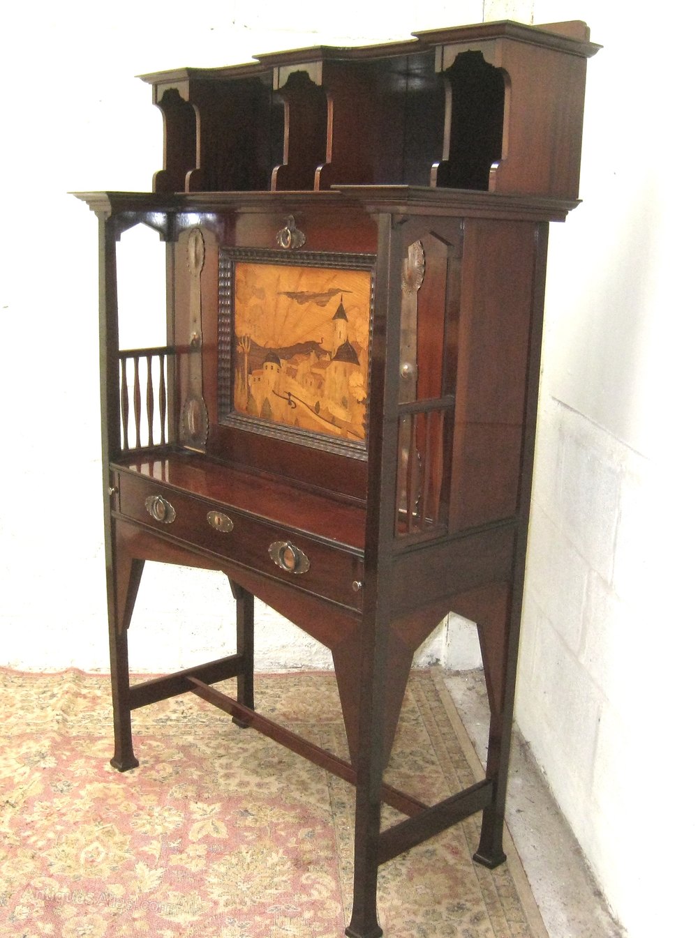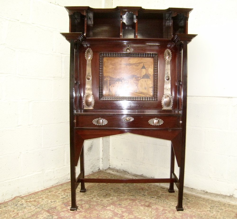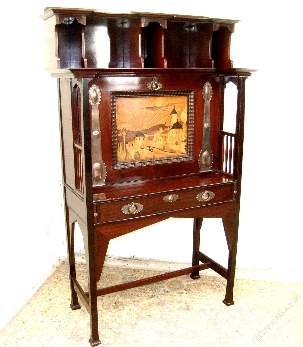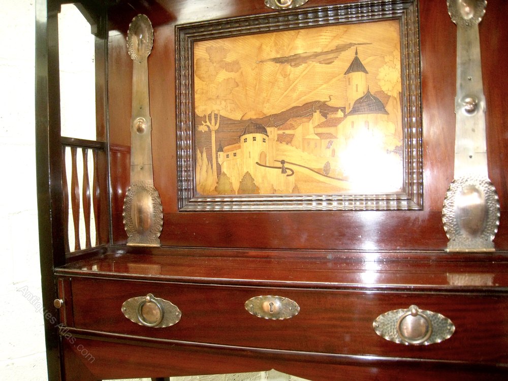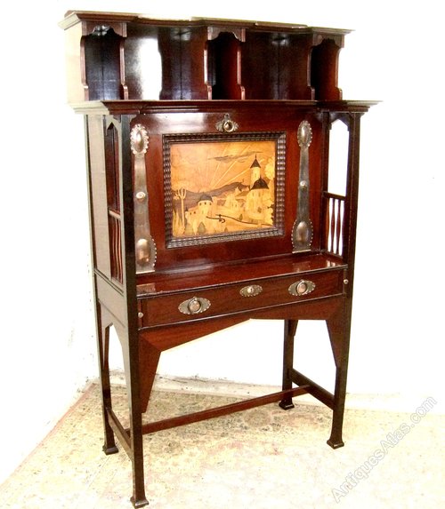 A superb example of the top quality Art and Craft antique furniture Shapland and Petter produced at the turn of the century This bureau is very well constructed with a marquetry panel and very nice copper strapwork. The interior of the bureau contains lots of useful compartments and two drawers A similar bureau is featured on the cover of Daryl Bennetts excellent book about Shapland and Petter. Locks are stamped ,are working and keys are present. The bureau is in Excellent original condition,having been throughly and carefully cleaned and finished with a wax polish . The number 141 is stamped on the rear . the price quoted includes personal delivery to UK mainland