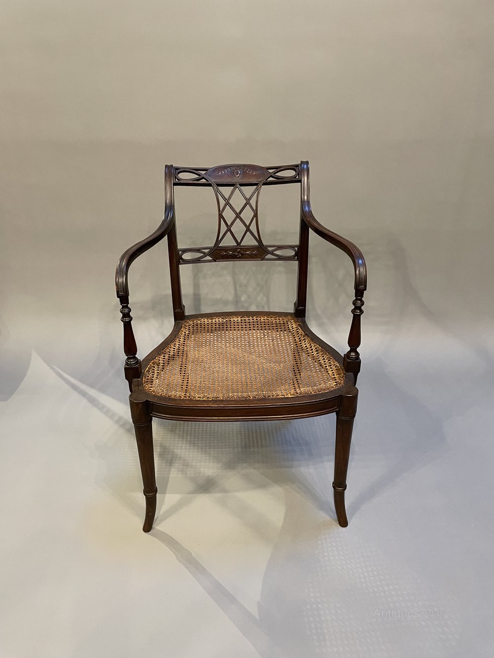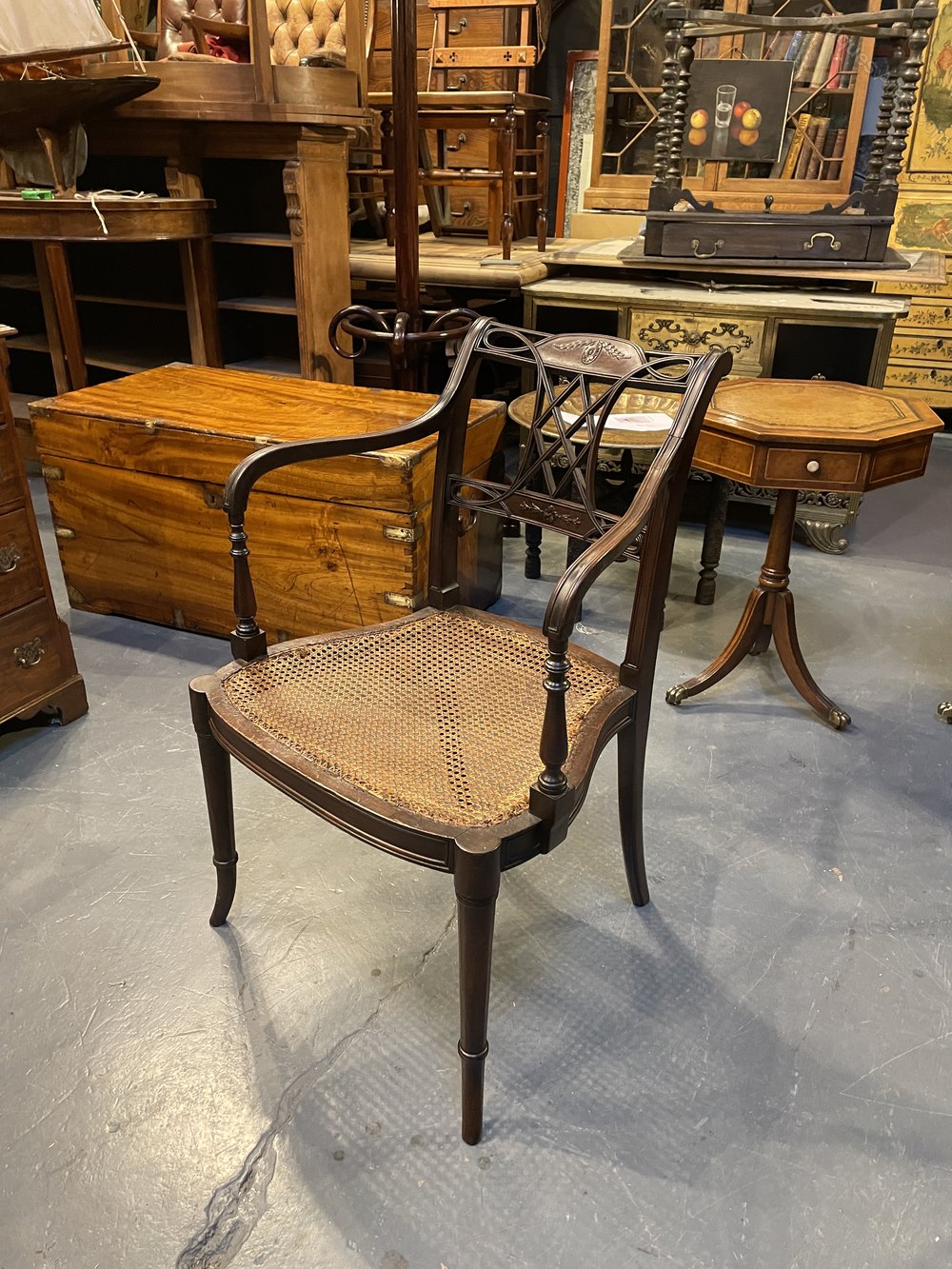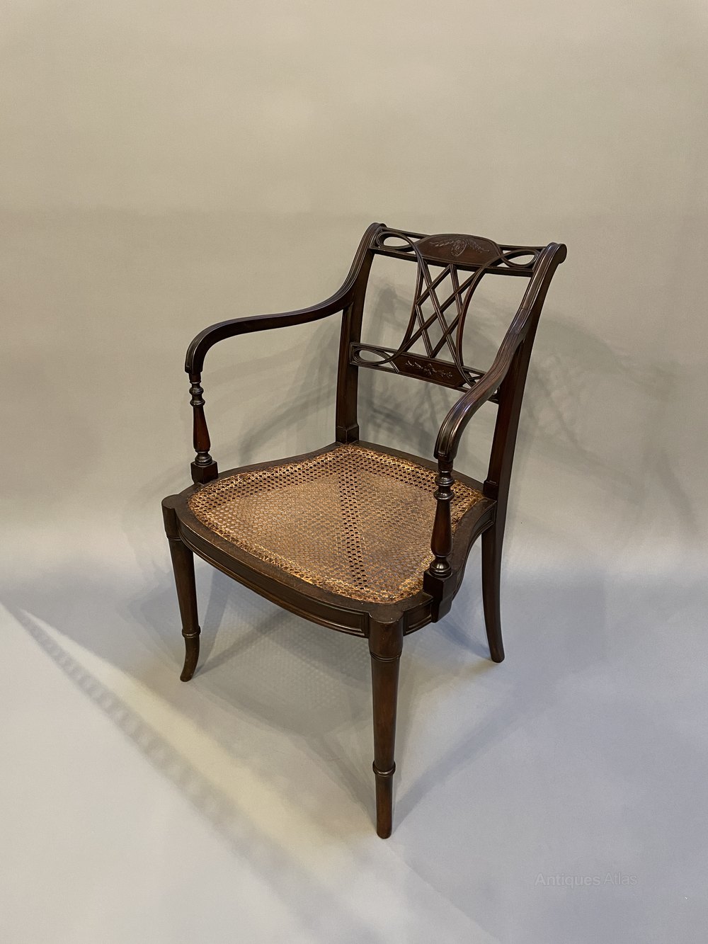Circa 1800 Sheraton Revival of well carved mahogany frame and caned seat.