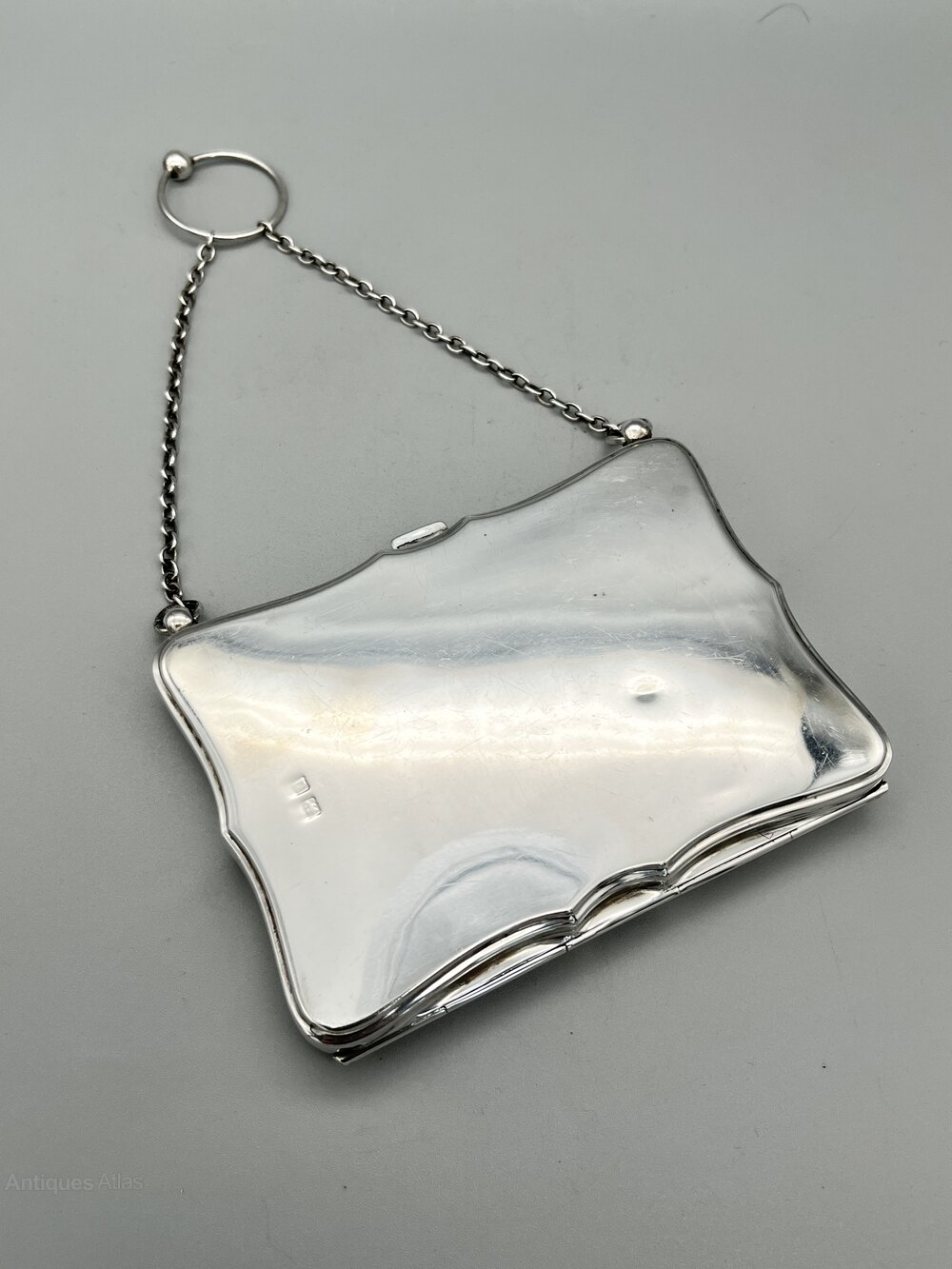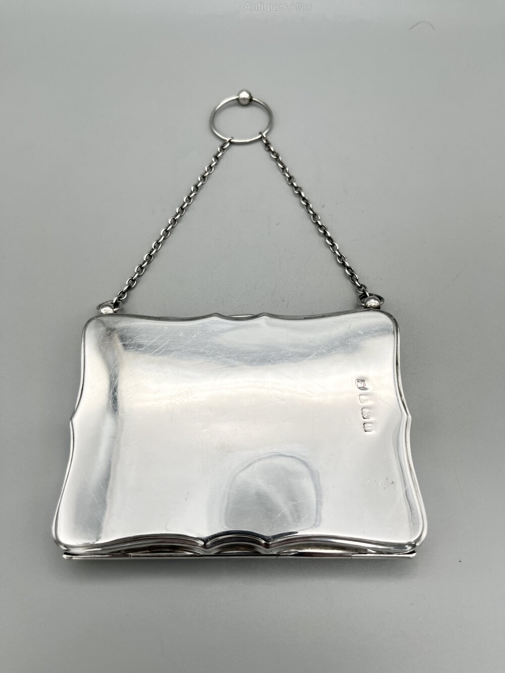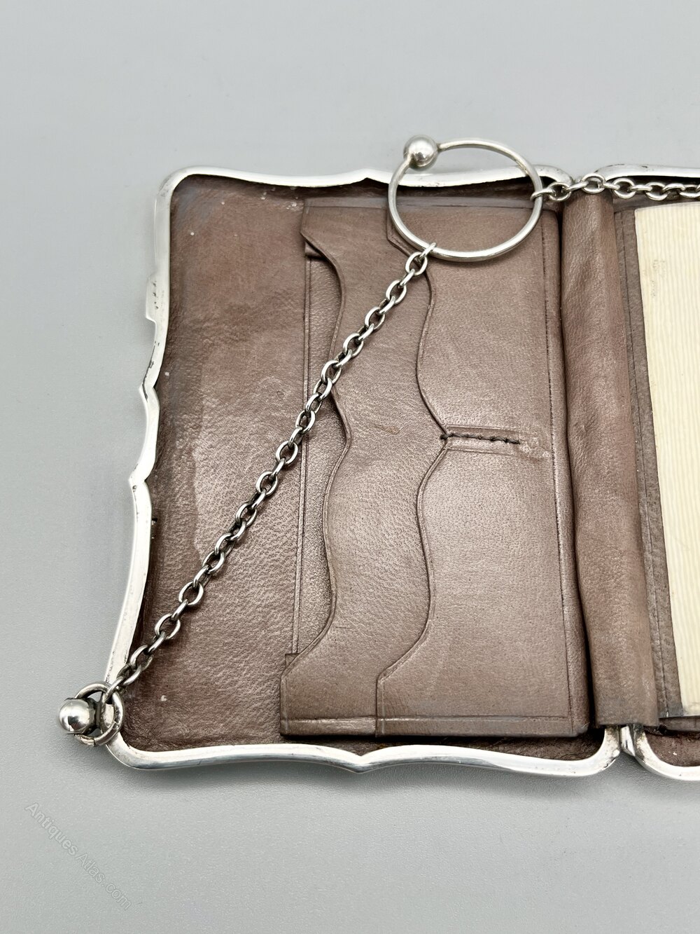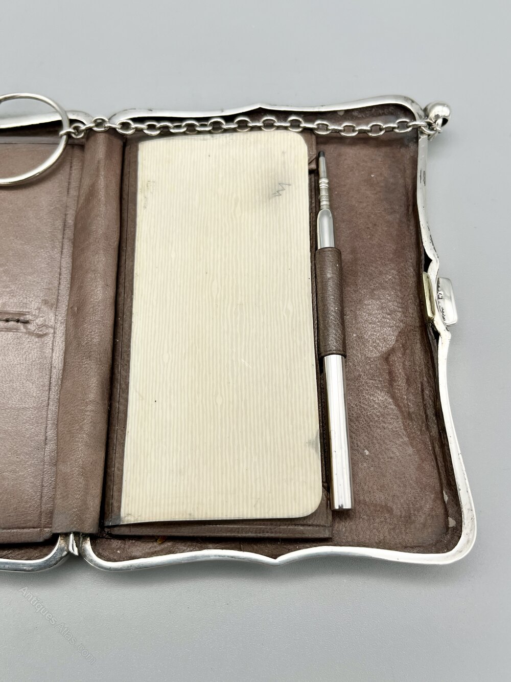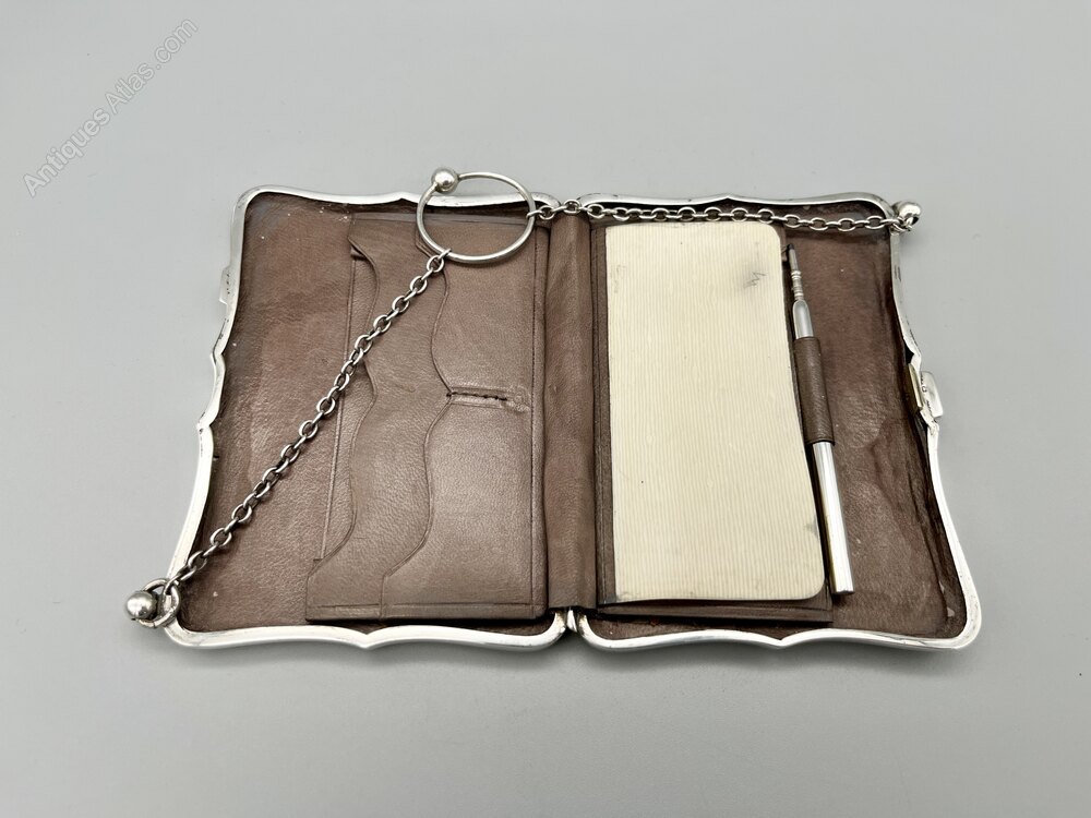 Here we have a top quality George V Sterling Silver combination Card Case, Stamp Holder and Aide Memoire, complete with pencil. The case is oblong with a scalloped rim and suspended on a chain with a finger ring handle. The interior is lined in chocolate brown leather with pockets for visting cards and stamps and a faux ivory writing plaque and accompanying pencil. There are no initials or personalisation of any kind.
