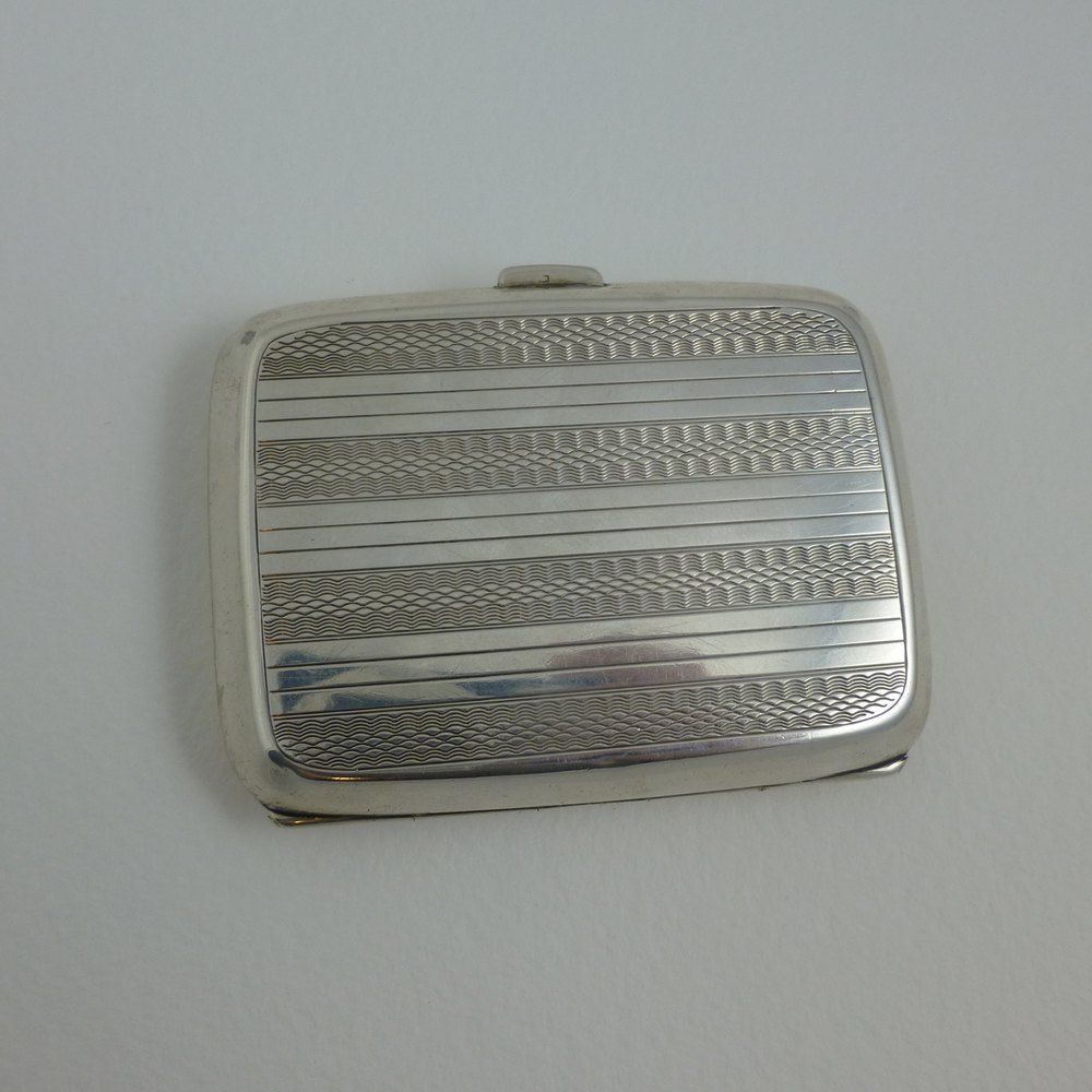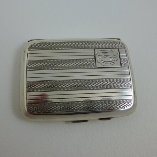 A silver cigarette case dated Birmingham 1946. The case is in very good condition and has a striped engine turned engraved design on the front and also on the back. There is a cartouche on the top left corner with engraved letters WRC. Button catch in good working order and inside the band holders still in place. The hallmarks are inside and very clear. A nice item for the collector