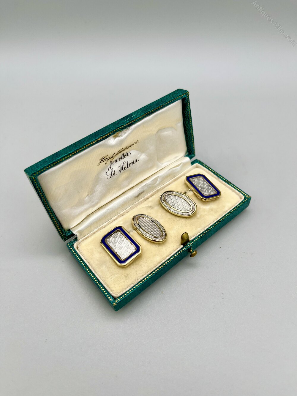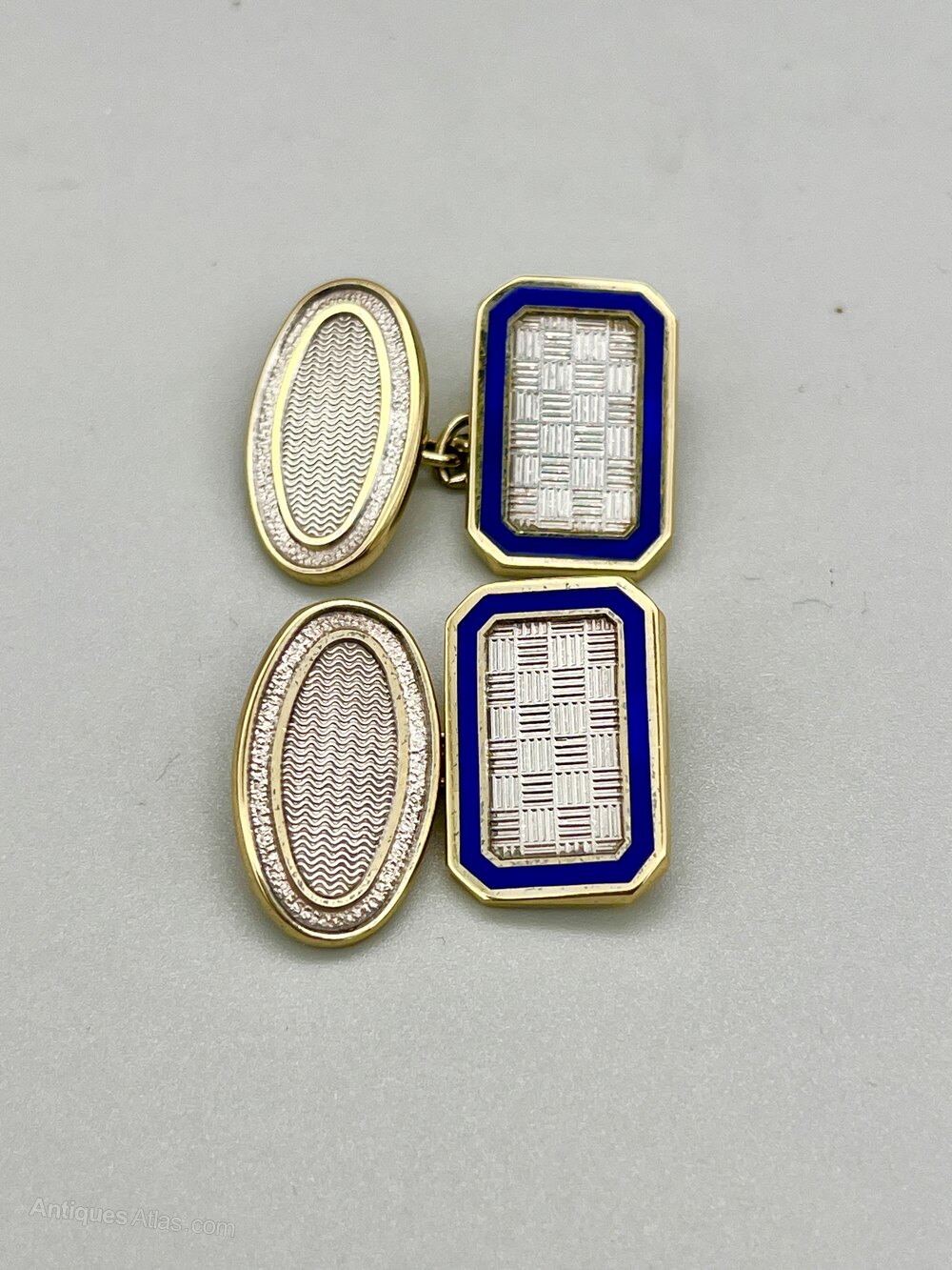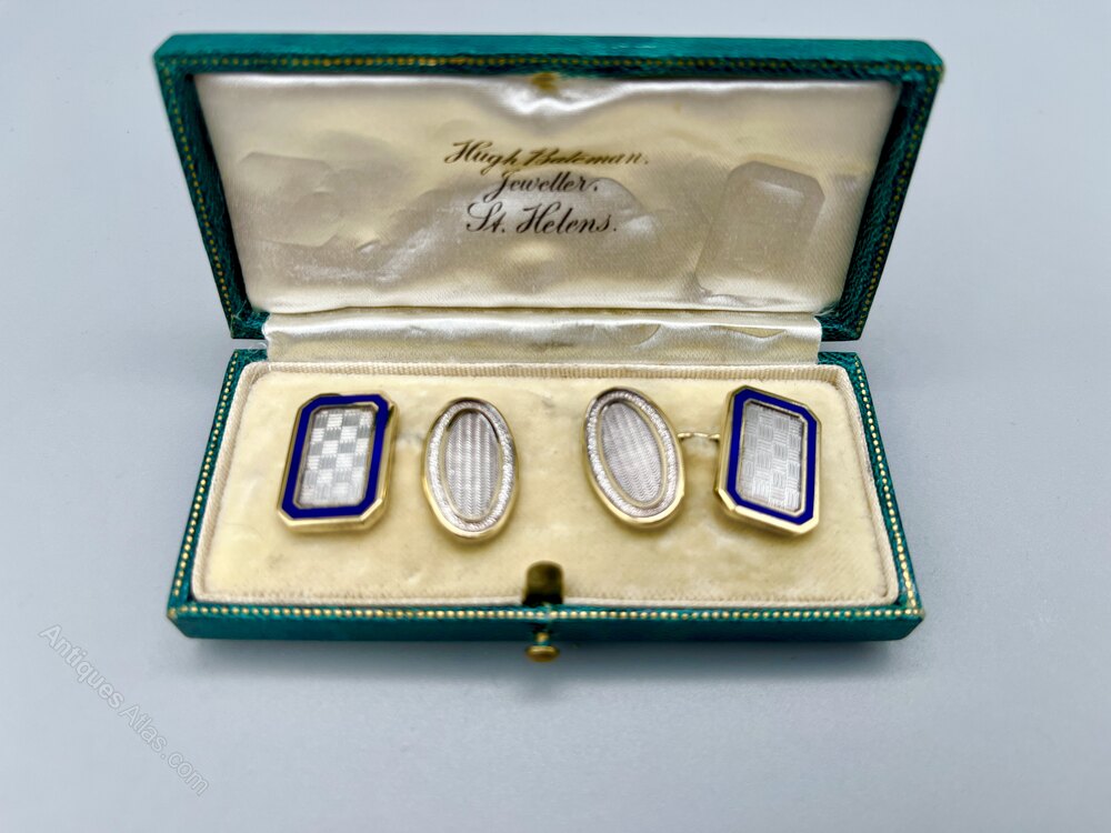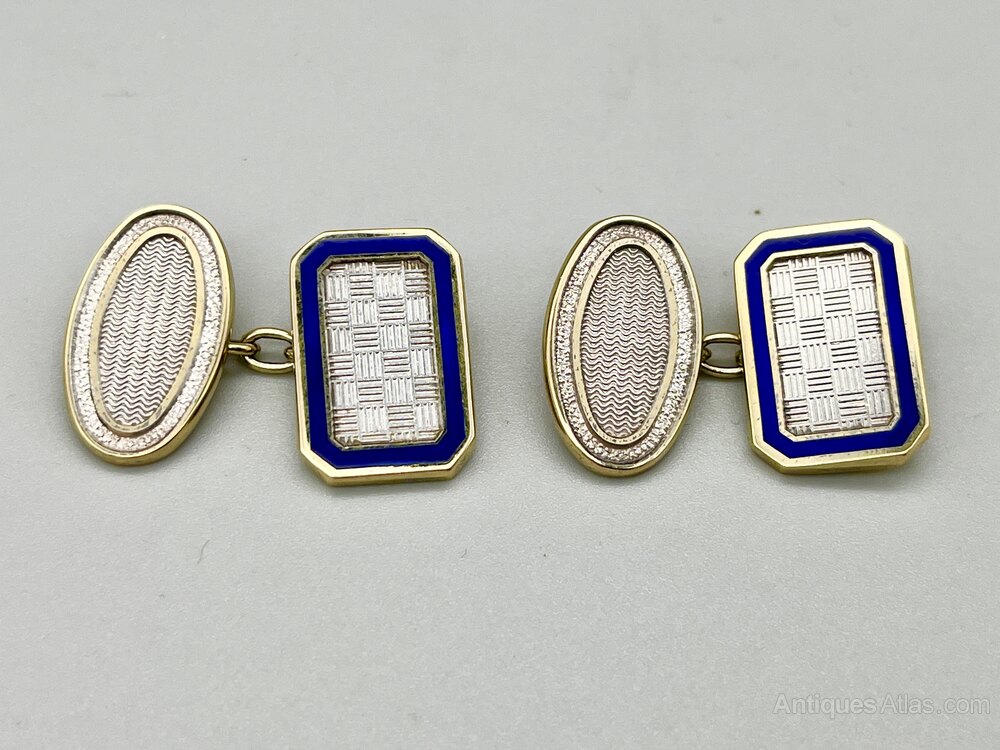 Here we have a superb quality set of Vintage Silver Gilt and Enamel Cuff Links. Each chain linked pair is made up of one oblong plate with a checkerboard design surrounded by blue enamel and one oval plate with a linear design and silver surround. They come in a green leather gift box with a cream satin and velvet interior.