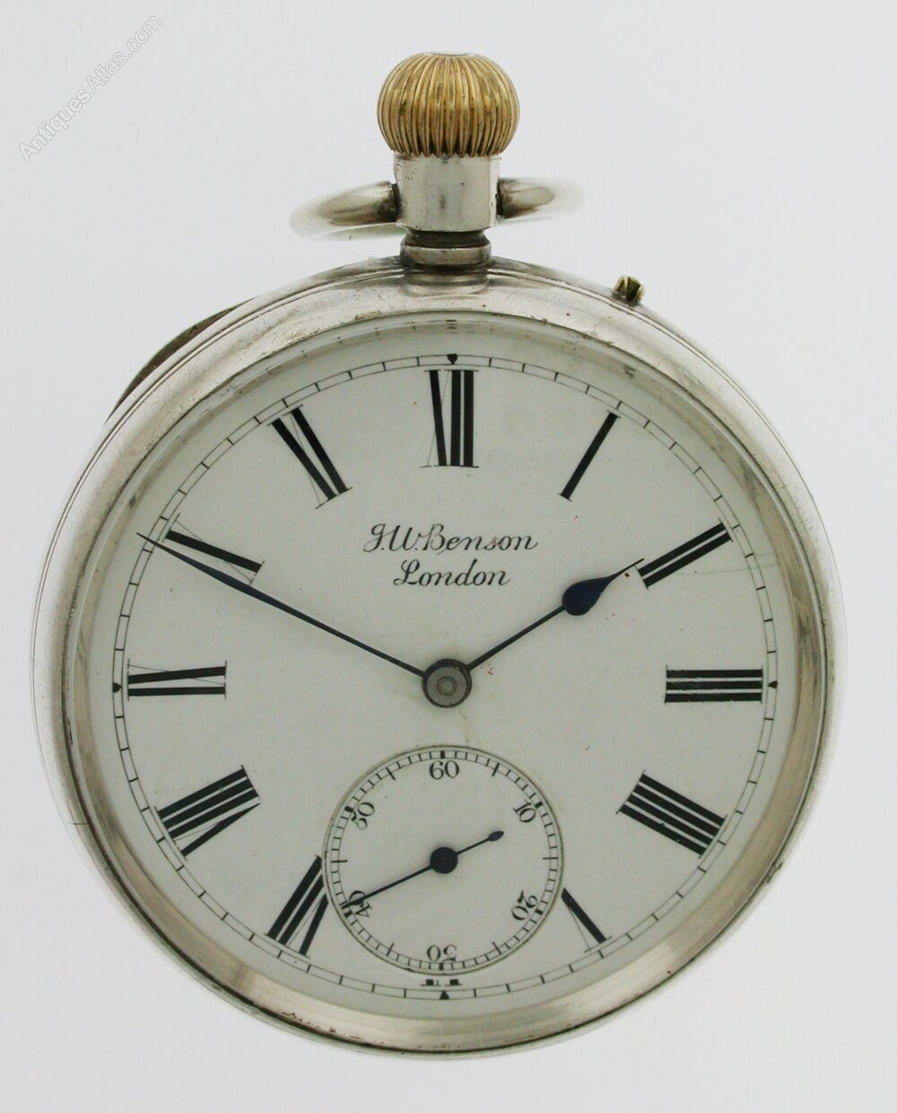 Dial: The white enamel dial has black Roman numerals , blued hands and an subsidiary inner sunken second’s dial at the six. The dial is signed: “J.W. Benson, London”.
