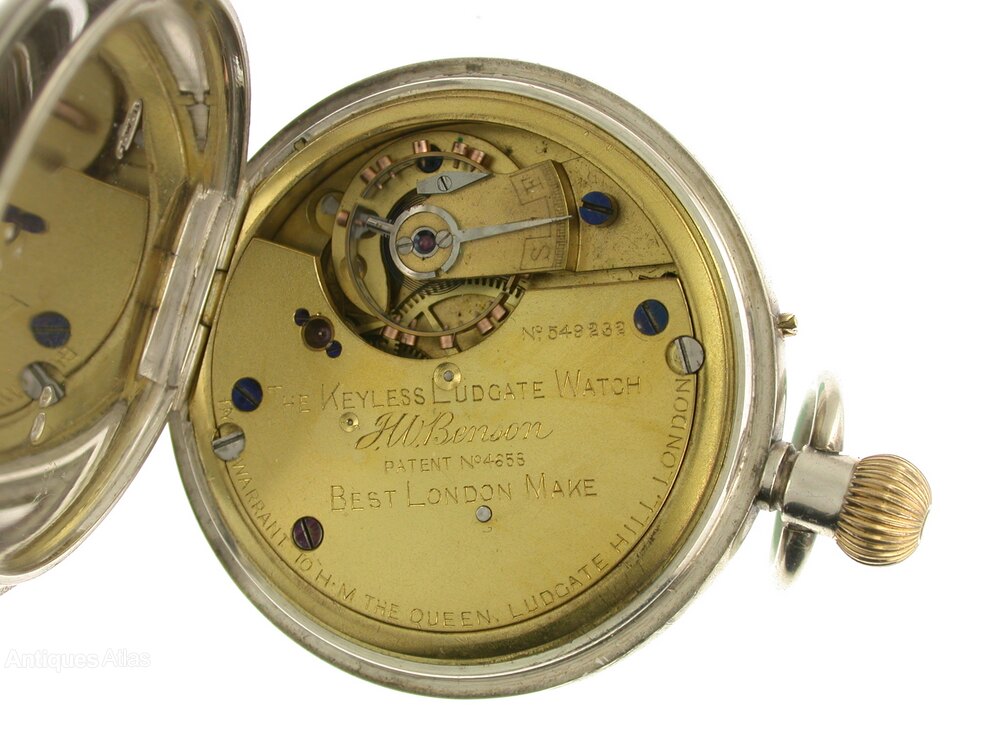 Movement: The three-quarter plate lever movement is in a very good working order. It is signed: “The “Ludgate” Watch. J.W. Benson, Patent No 4658, Best London Make, By Warrant to H.M. the Queen, Ludgate Hill, London.” The movement number is: 59232.