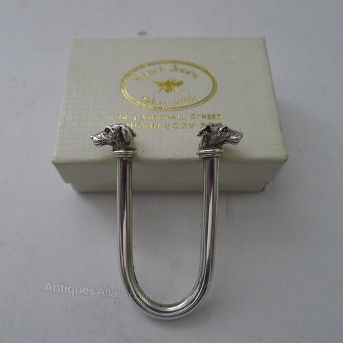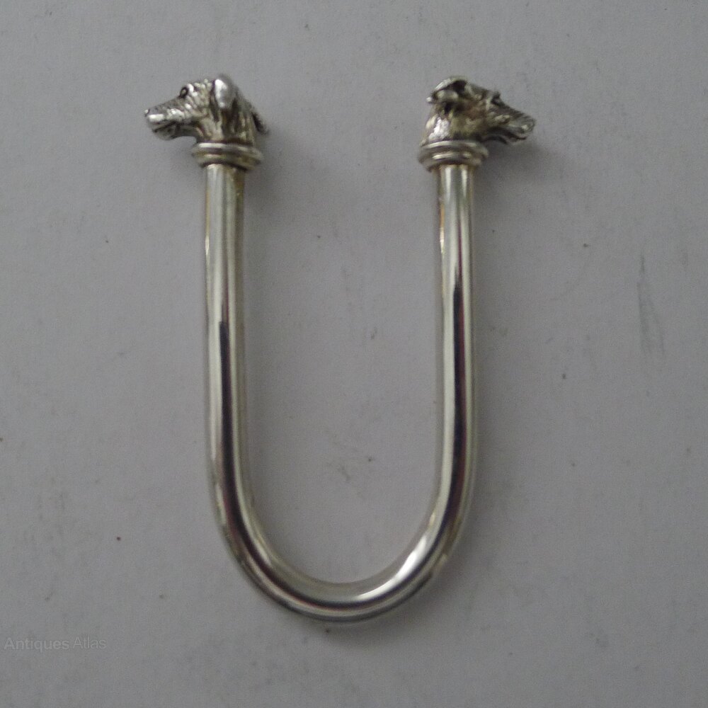 The "U-shaped" napkin ring has a beautifully executed dog's head on each terminal. The napkin ring is fully hallmarked for London 1986 together with the makers mark for Sarah Jones.