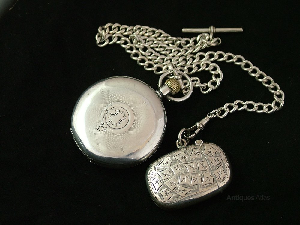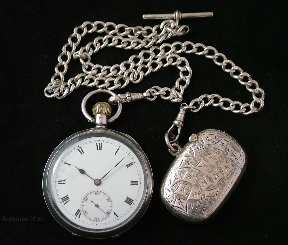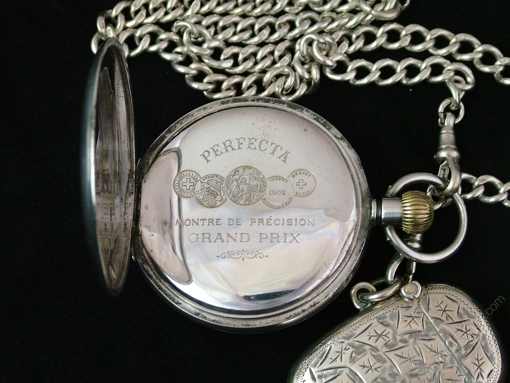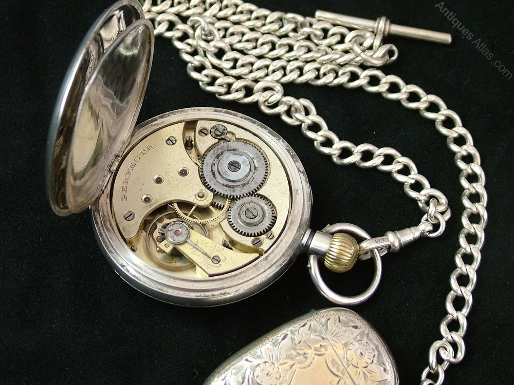 Silver Perfecta pocket watch, albert and vesta