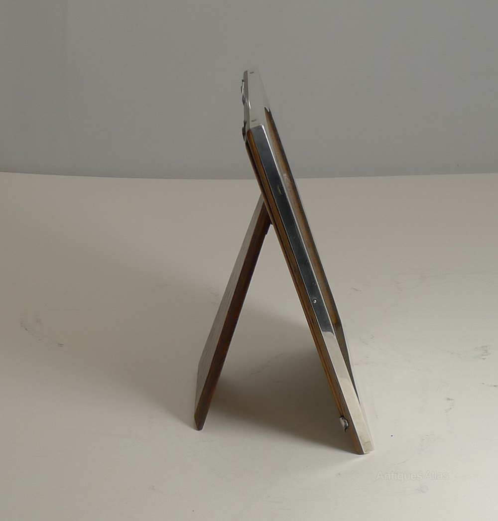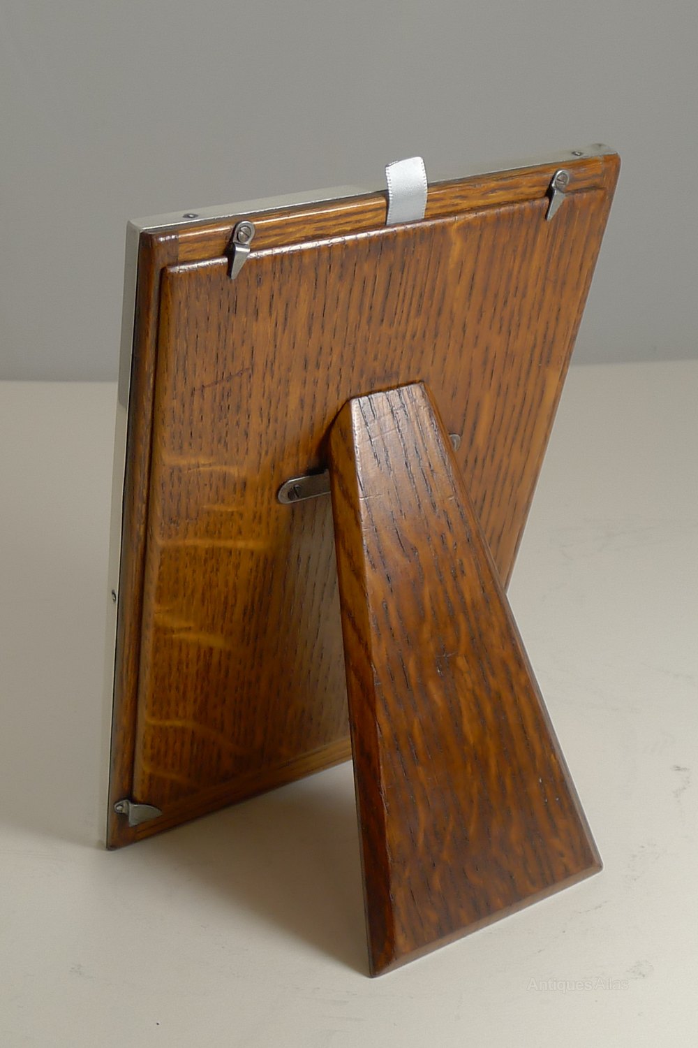 The aperture is rather unusual, beautifully shaped at the top. The solid English Oak backing incorporates a folding easel stand.
